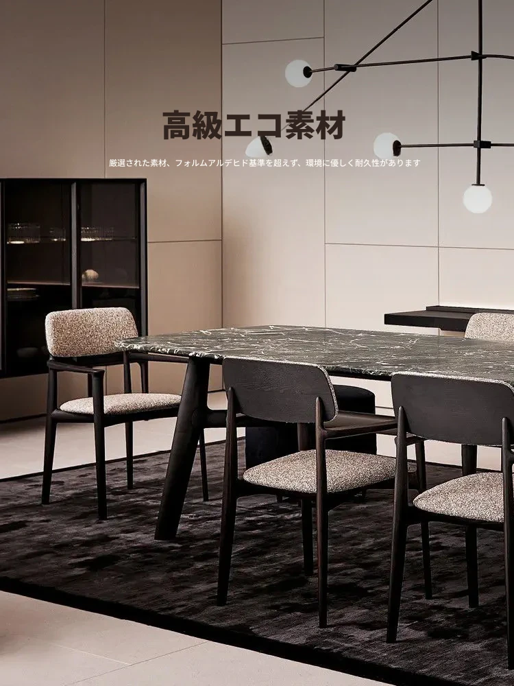 イタリアンミニマリズムの現代的なデザイン、シックなブラックの布製アームチェア。ホテルや別荘にぴったりのアンティーク風の木製ダイニングチェア。優雅なライフスタイルを演出します!