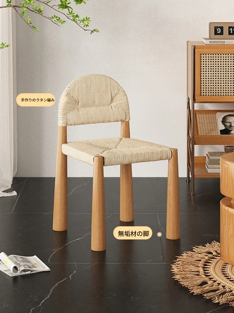 ミニマルクリームデザインのレトロな無垢材とラタン編みの一人掛けダイニングチェア、侘寂風の家具。シンプルでありながら洗練された美しさを持つ、心地よい空間を演出します。