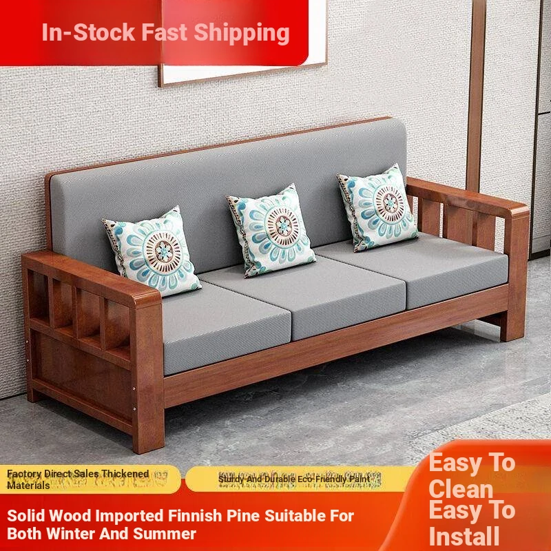 Modern Chinese Style Solid Wood Sofa Set - Compact Three-Seater for Small Living Rooms - Simple and Affordable Natural Wood Couch for Home Use