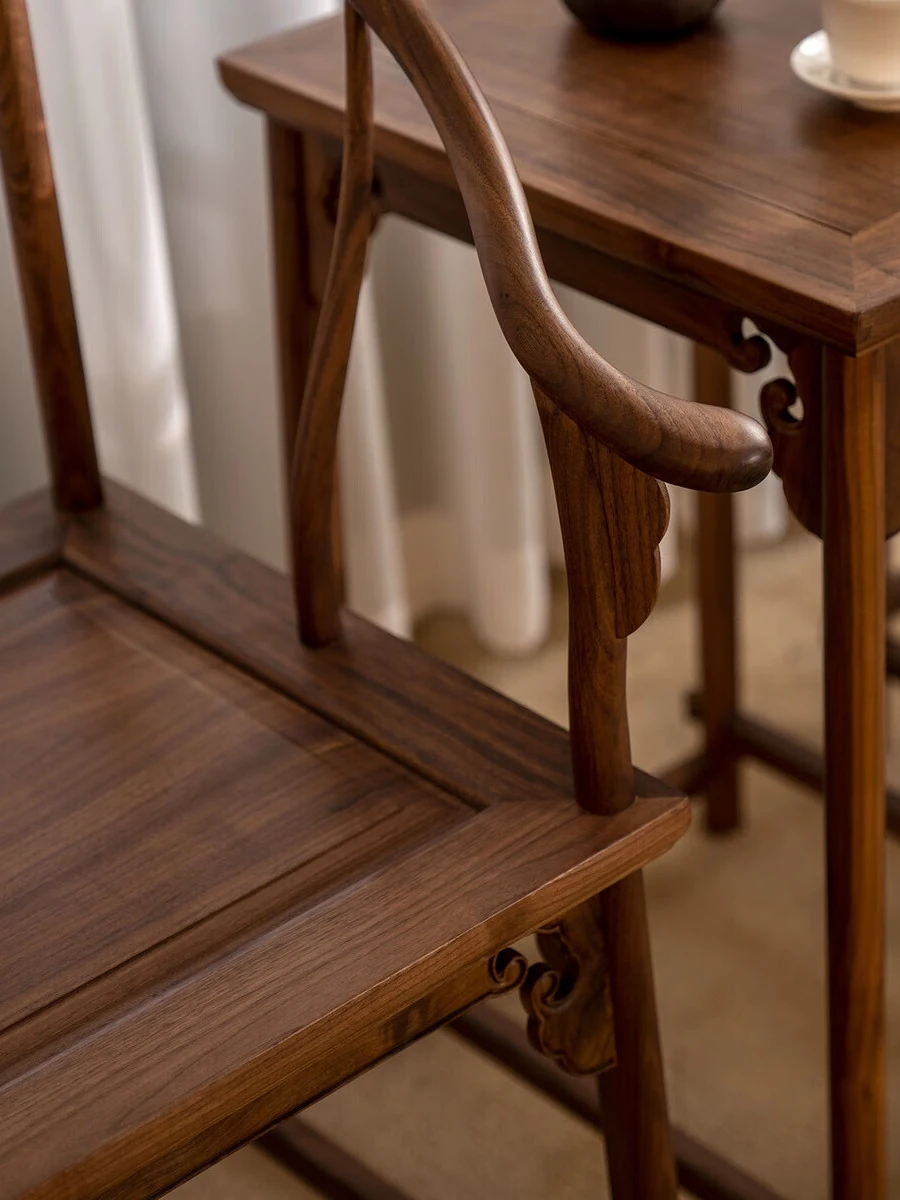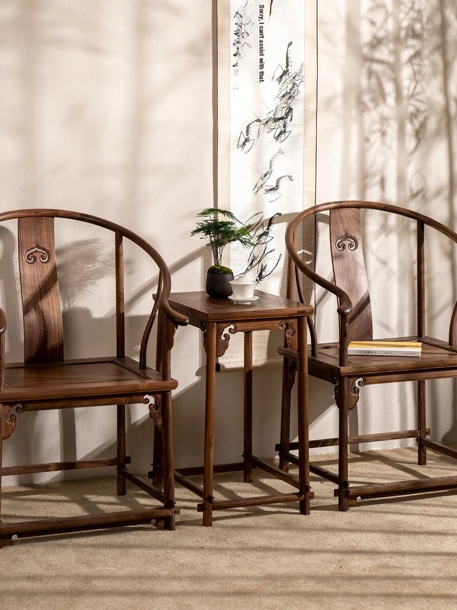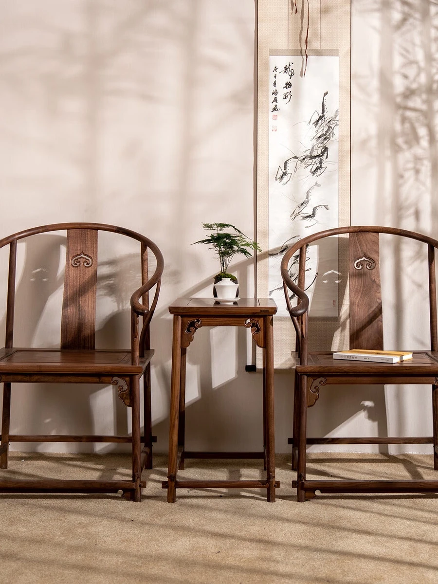 Solid Wood New Chinese Style North American Black Walnut Circle Chair Coffee Table Three-Piece Set - Ming Style Zen Chair, Tea Chair, Corner Table, and Grand Teacher Chair. Perfect for enhancing your home decor with elegance and comfort!