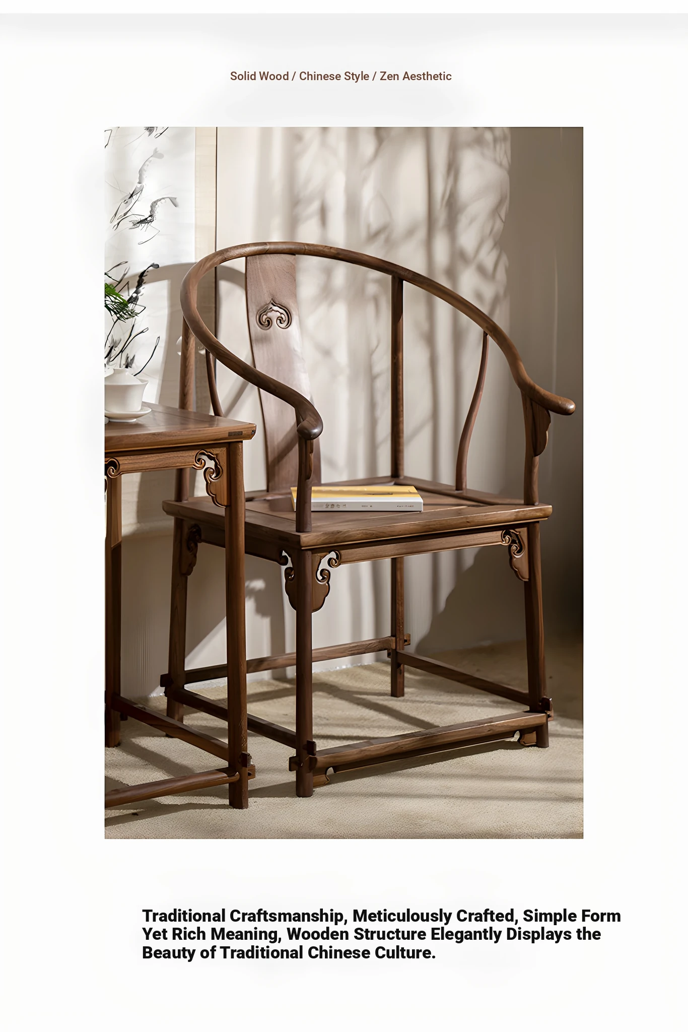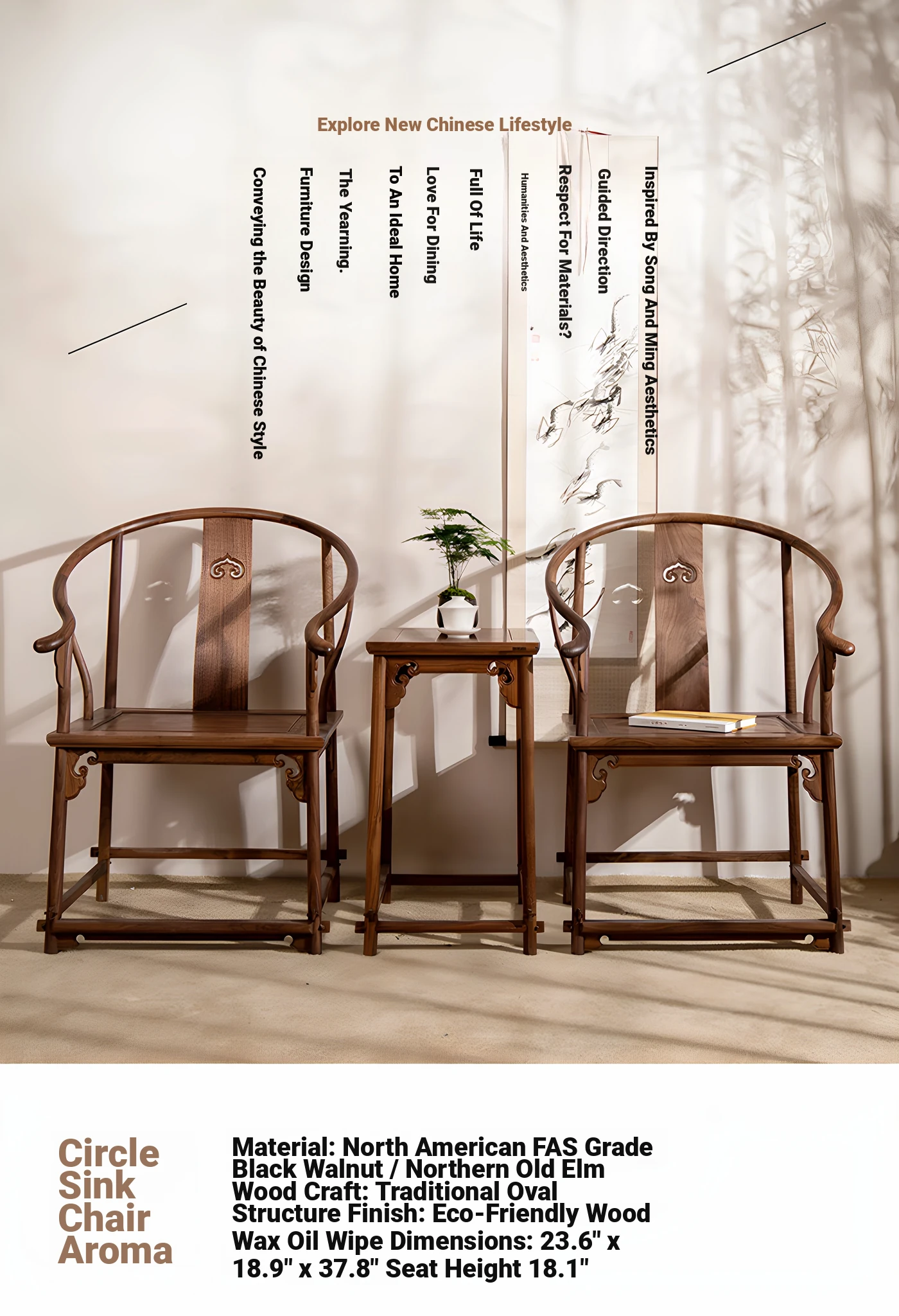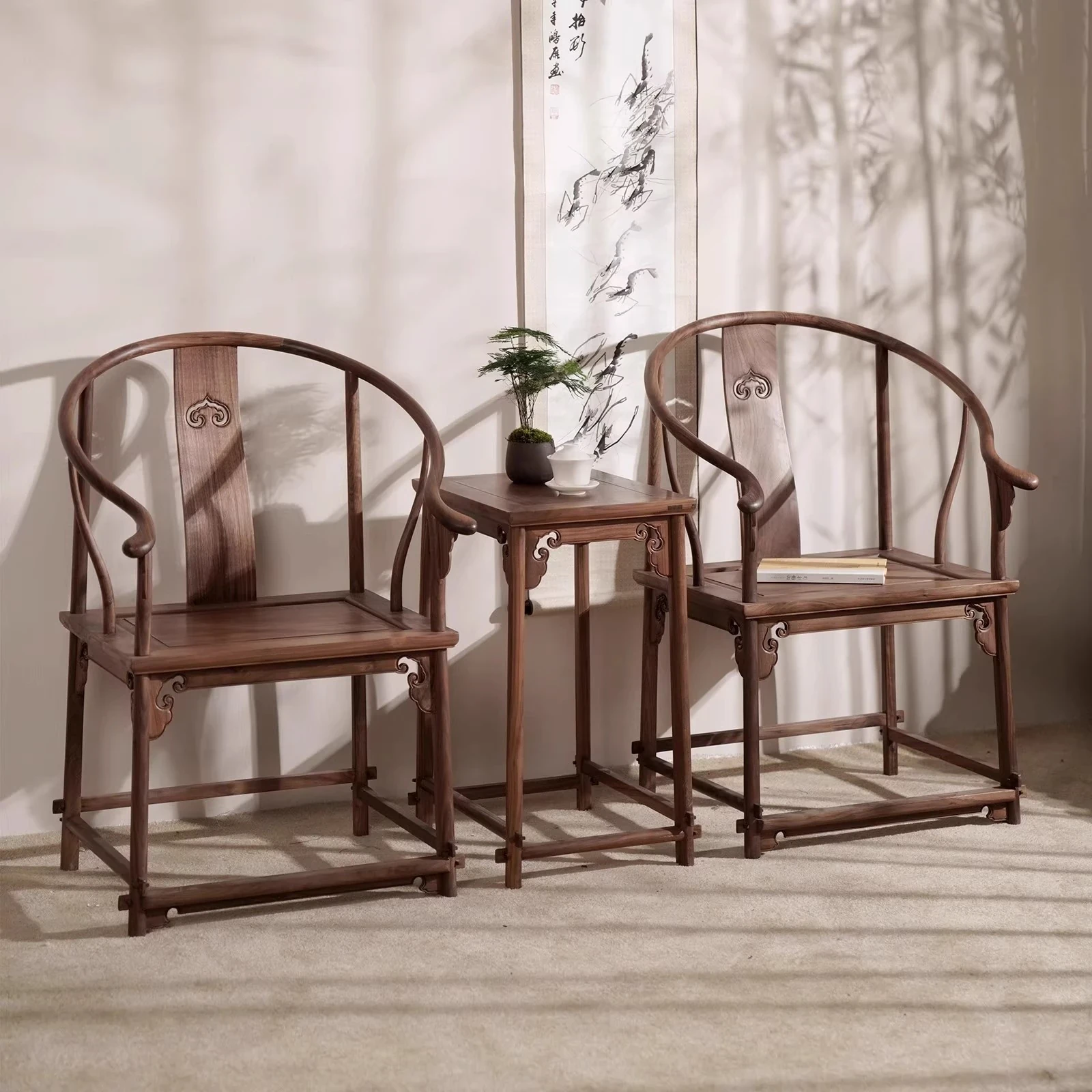 Solid Wood New Chinese Style North American Black Walnut Circle Chair Coffee Table Three-Piece Set - Ming Style Zen Chair, Tea Chair, Corner Table, and Grand Teacher Chair. Perfect for enhancing your home decor with elegance and comfort!