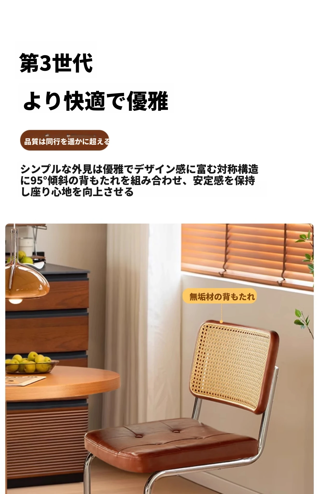 ナチュラルウッド色の無垢材の背もたれ+グロスオイルレザーのブラウン