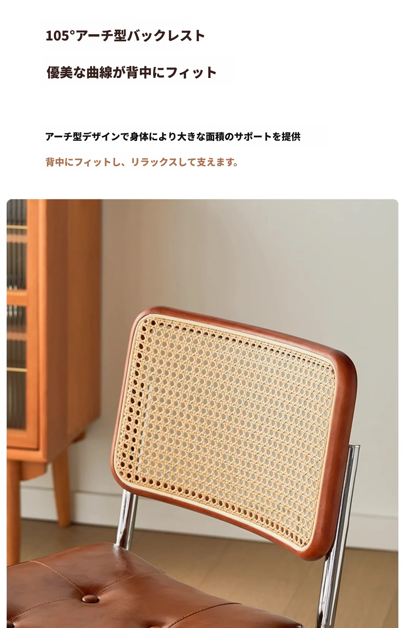 ナチュラルウッド色の無垢材の背もたれ+マットオレンジのクッション