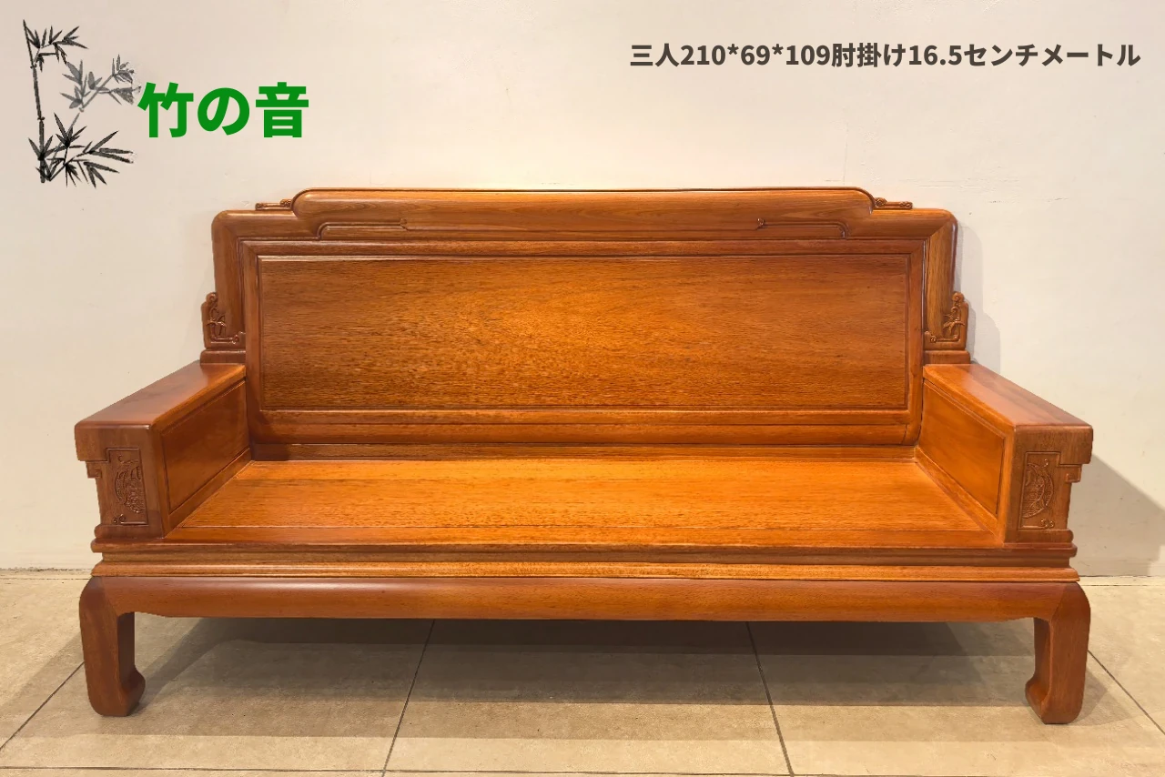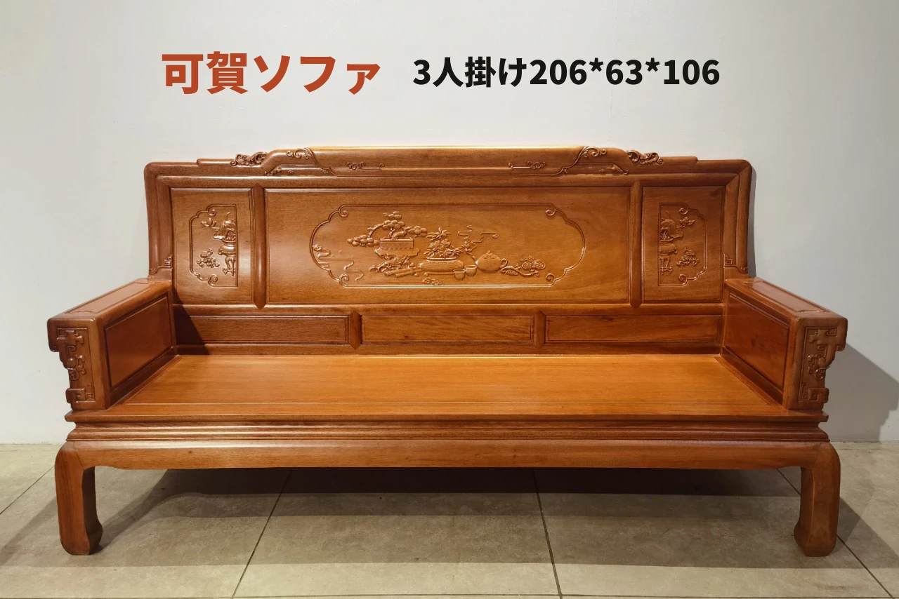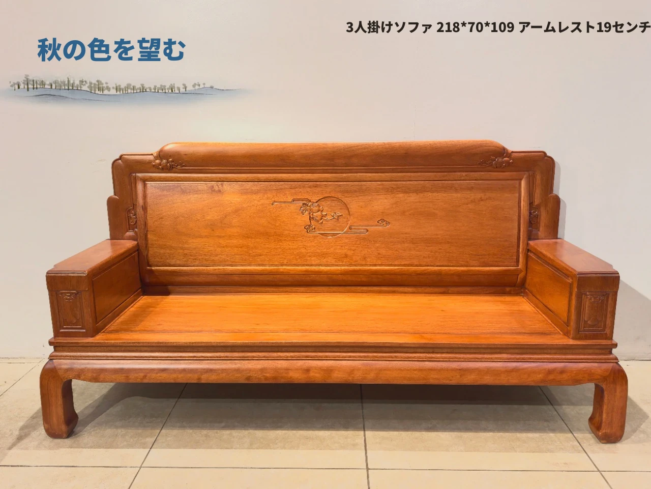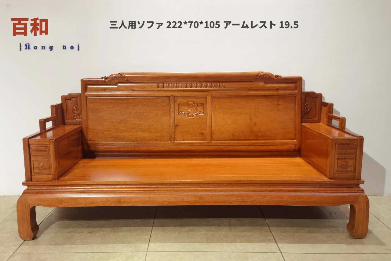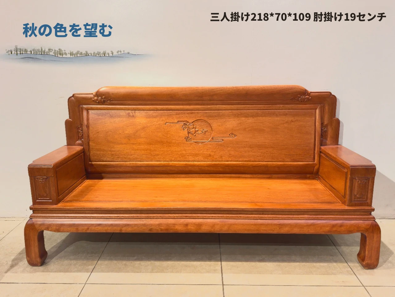 高級紅木ソファ - パイナップルウッド製の彫刻デザイン、シンプルでエレガントな3人掛け長椅子。全て天然の花梨木を使用した、リビングルームにぴったりの贅沢な一品。