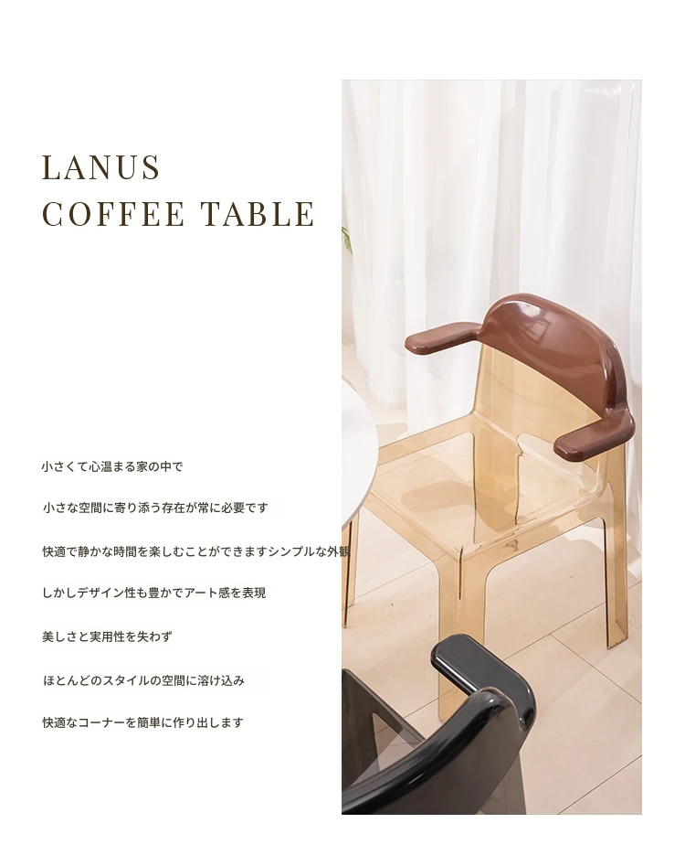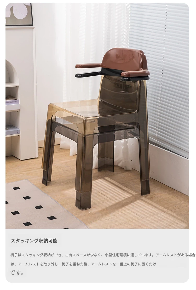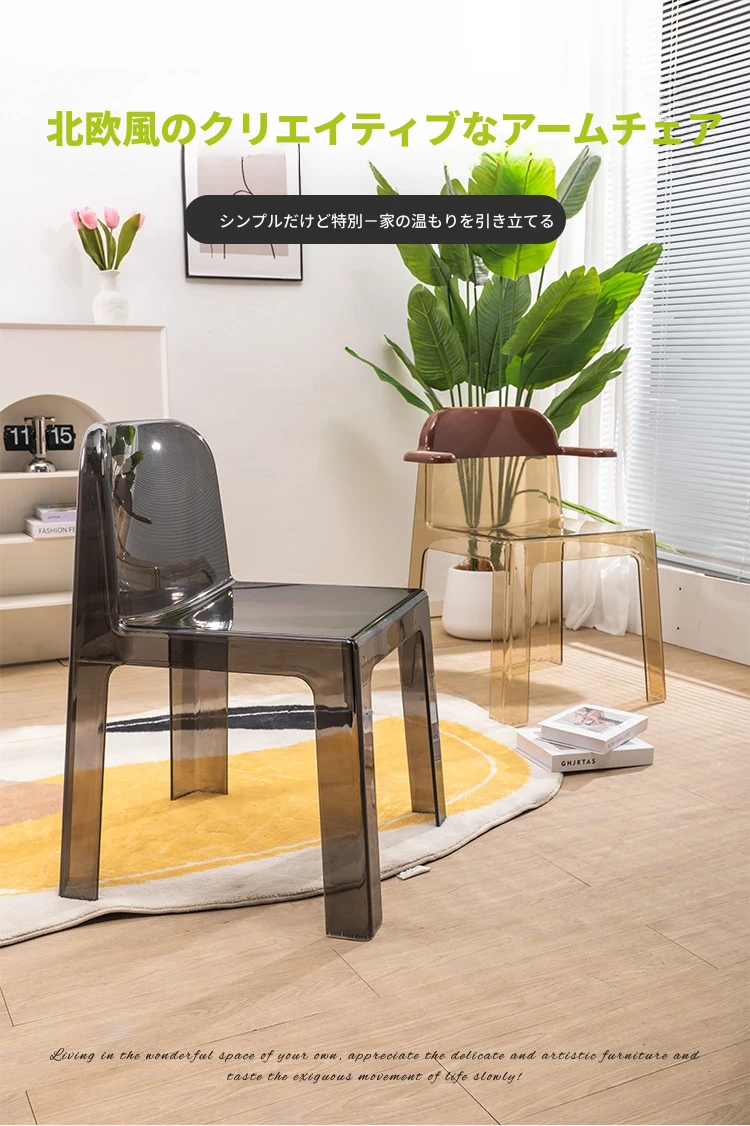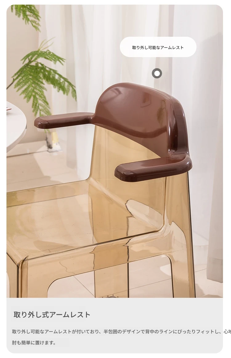 北欧風シンプル透明ダイニングチェア|おしゃれなインスタ映え!リビングや小さなダイニングにもぴったりな肘付き&背もたれ付きの快適なリラックスチェア!