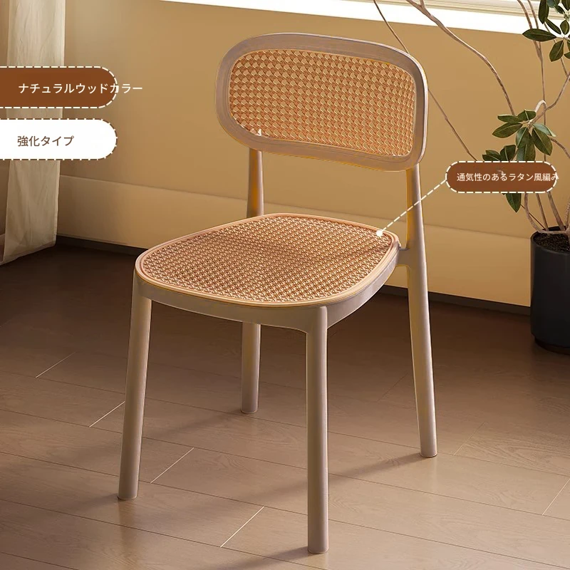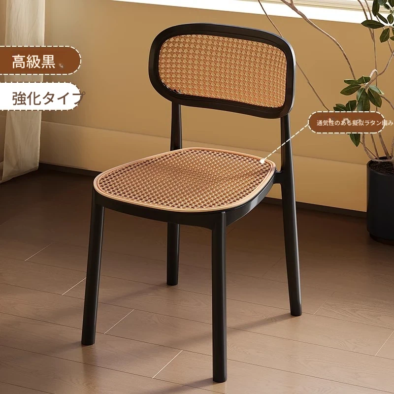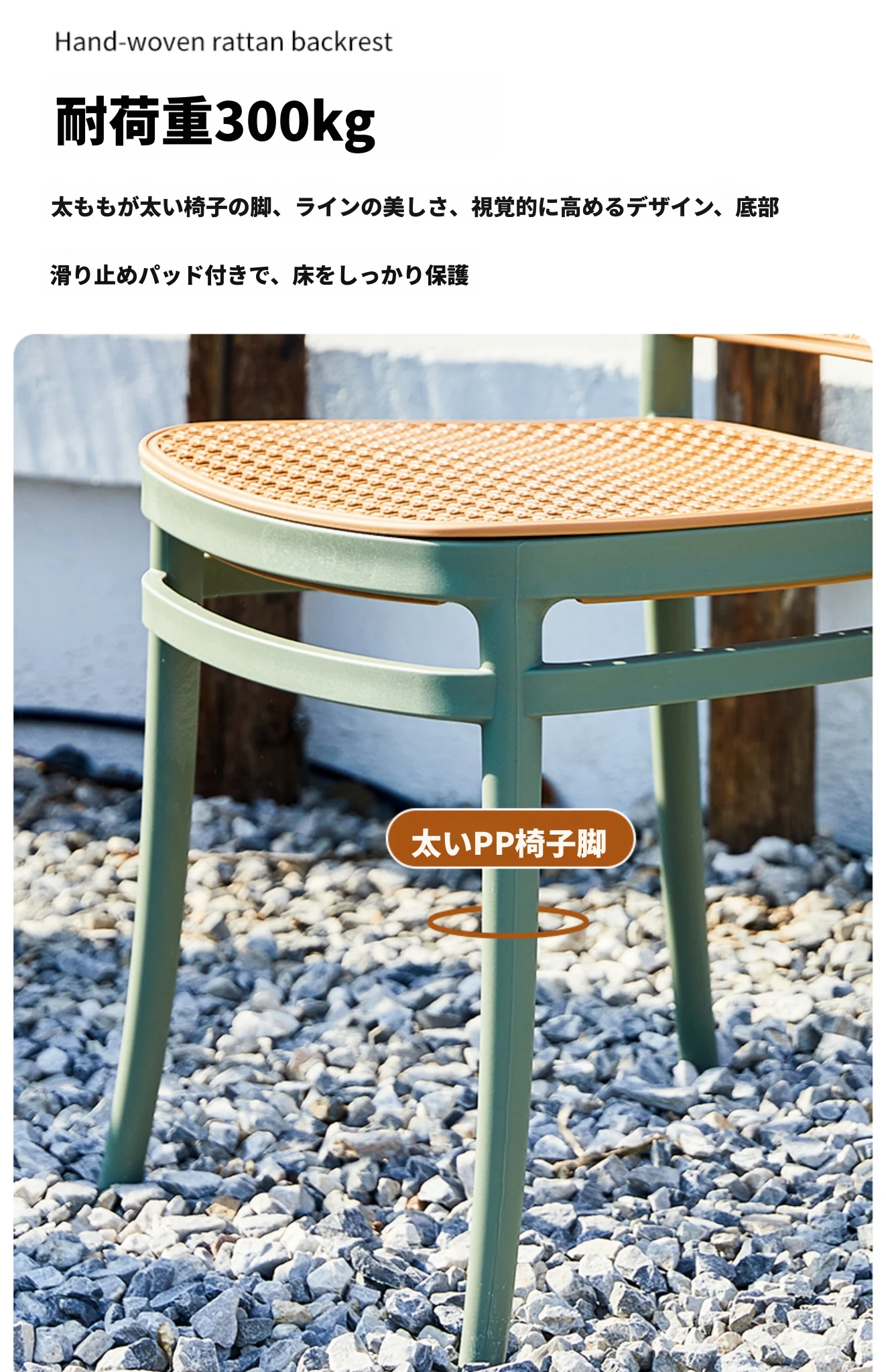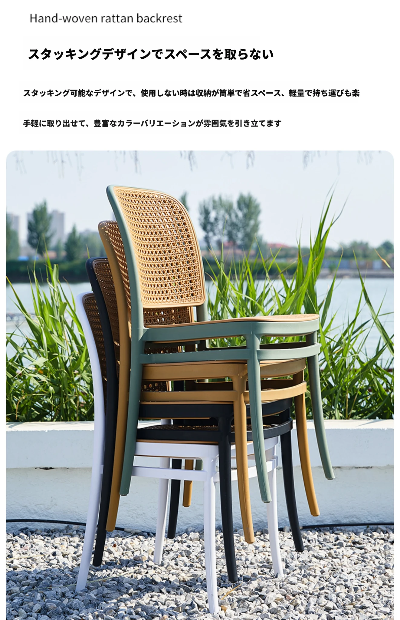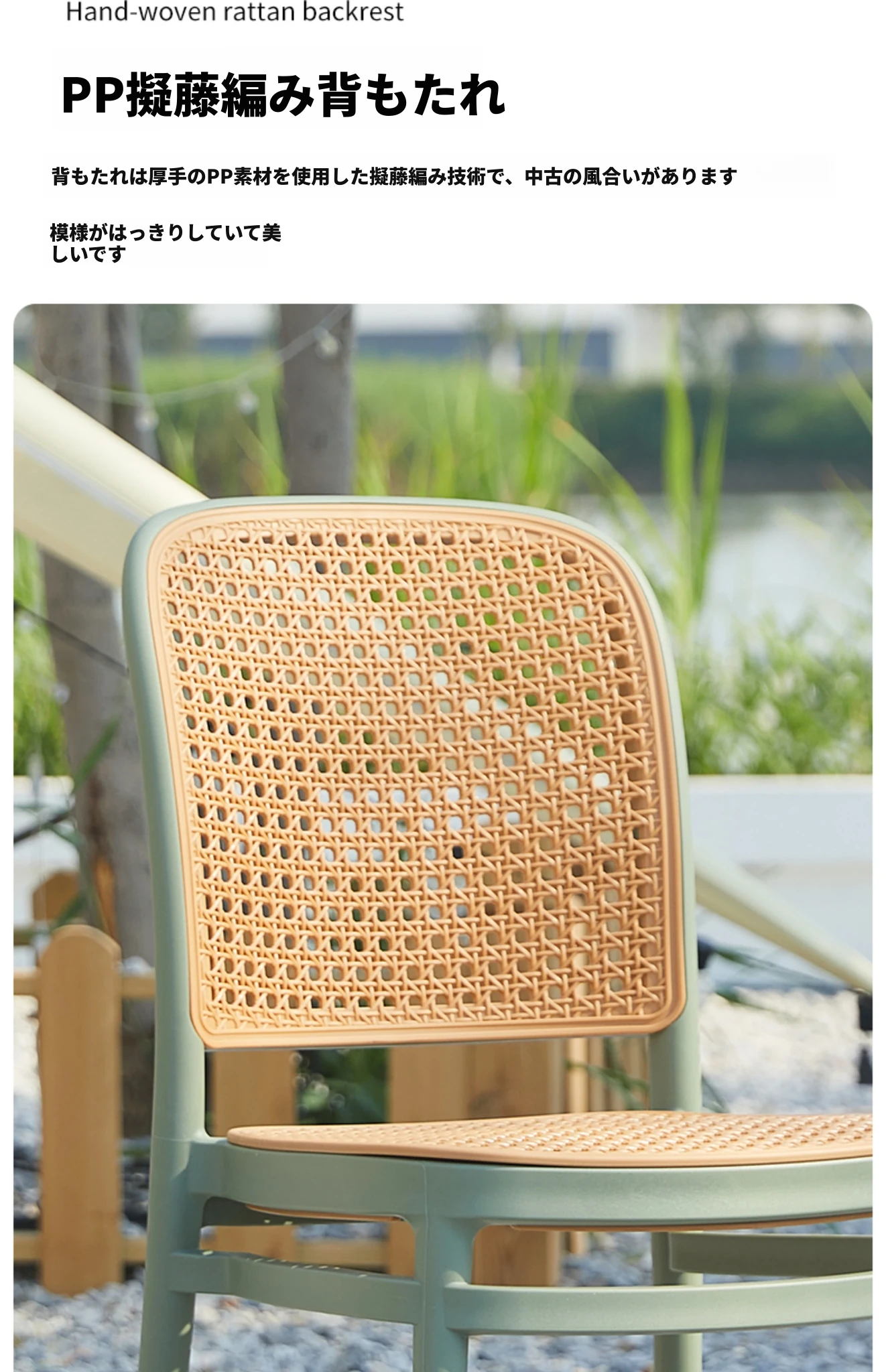 北欧風シンプルデザインの屋外用プラスチック製ダイニングチェア - スタッキング可能で、快適な背もたれ付き!おしゃれなラタン風デザインで、家庭やカフェにぴったり!