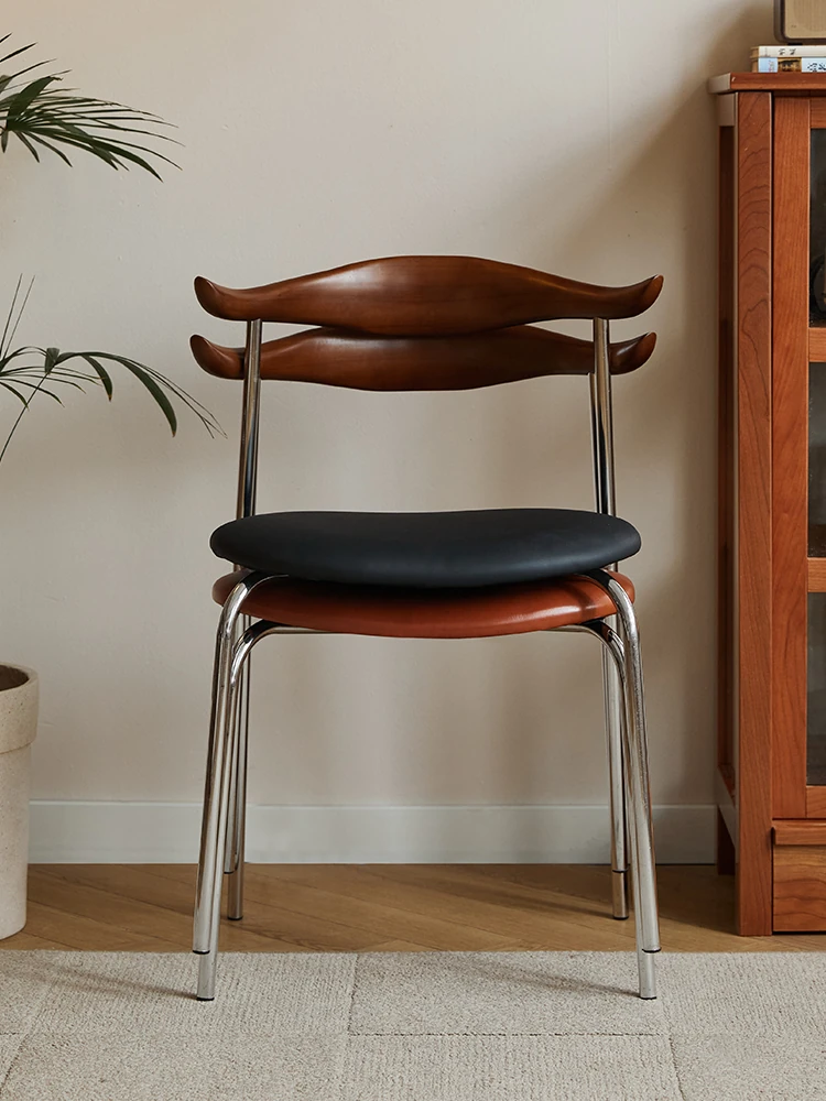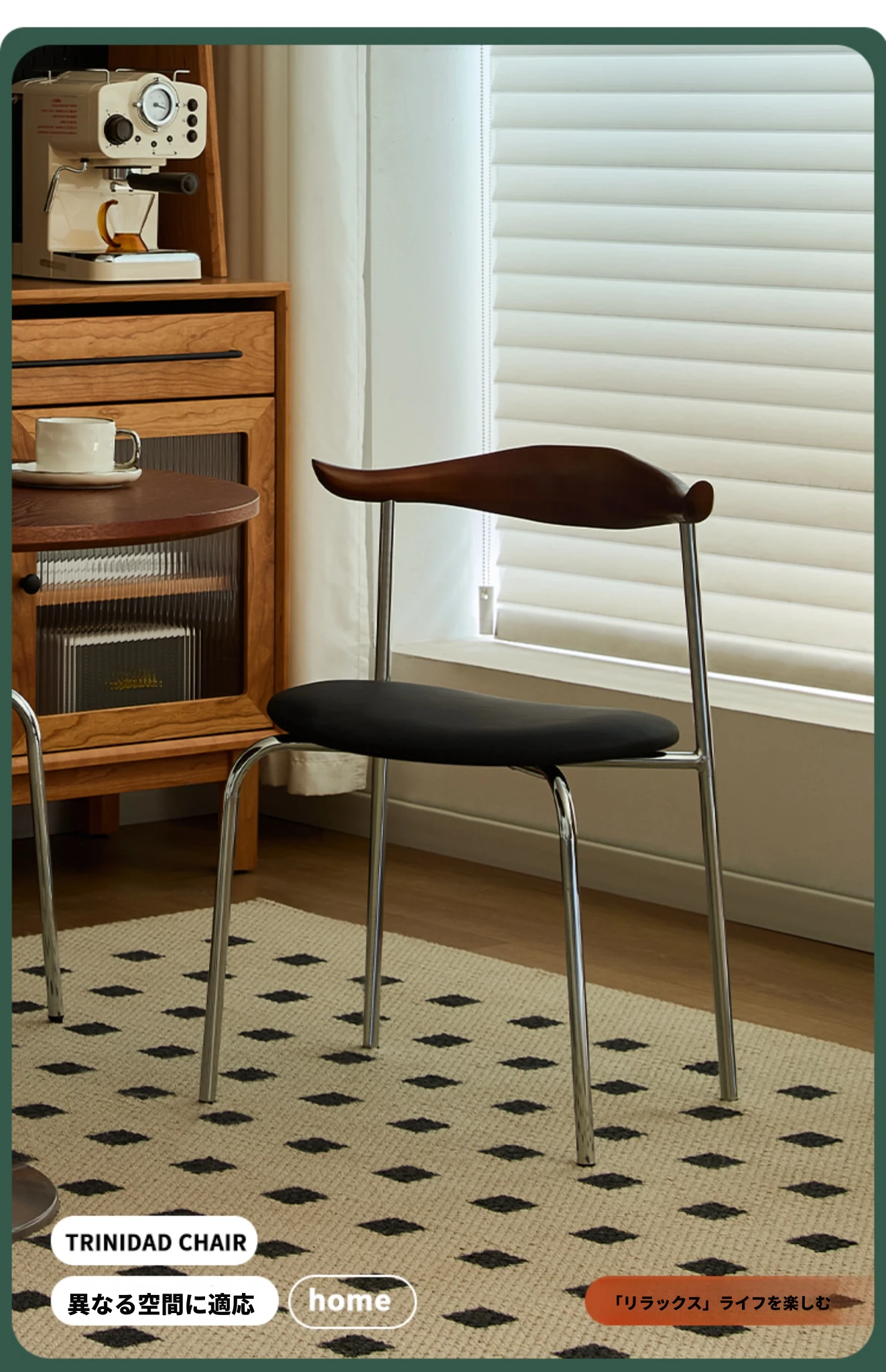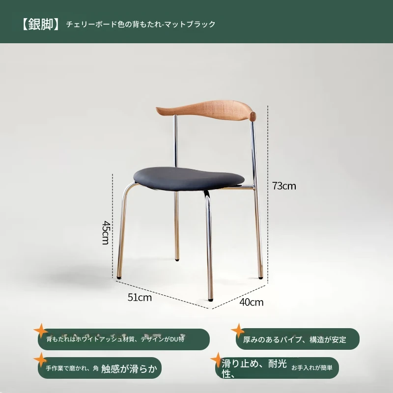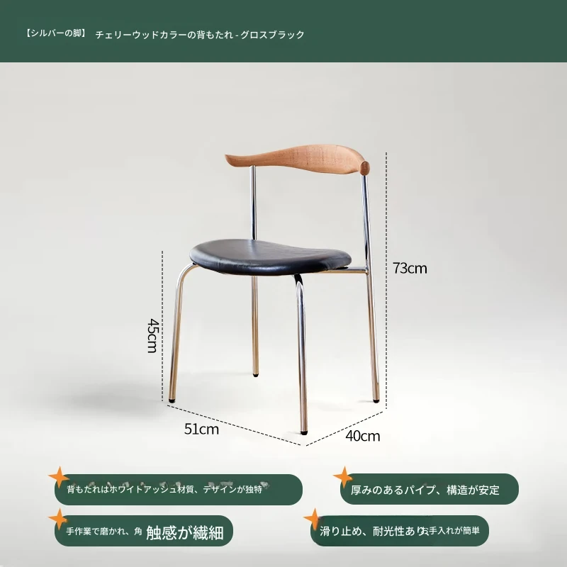 チェリー色の無垢材背もたれ-マットな黒クッション-銀脚