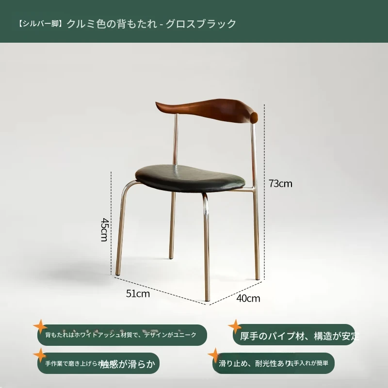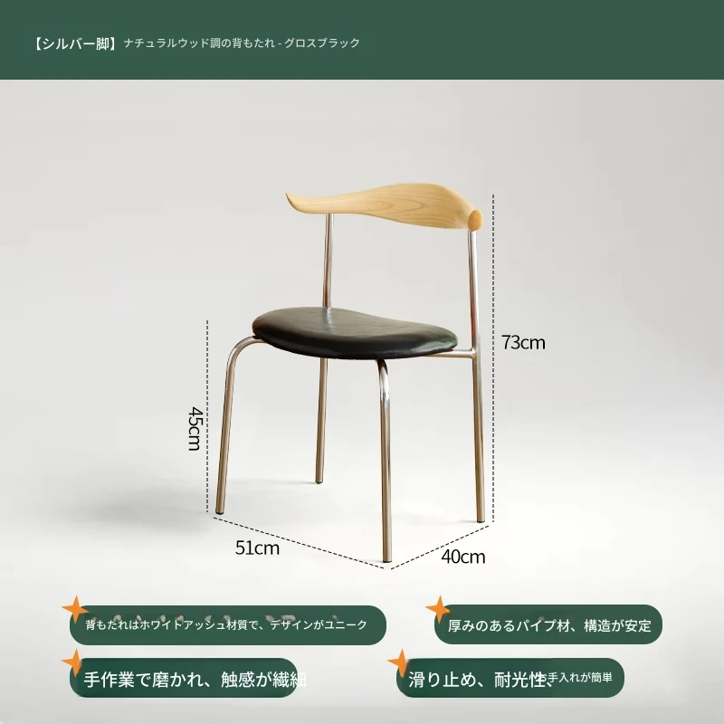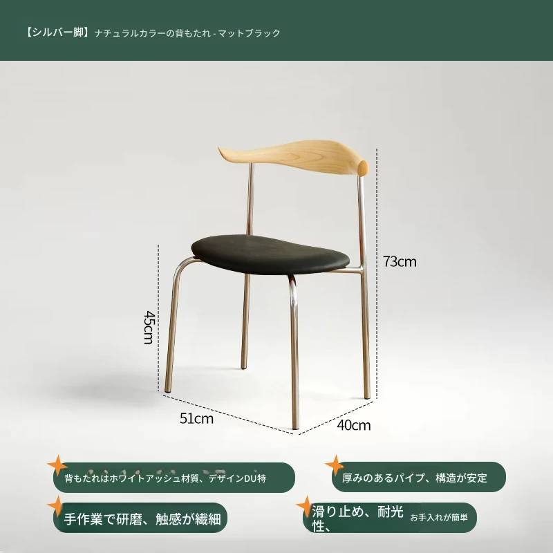 浅い木目色の無垢材背もたれ-マットな黒クッション-銀脚
