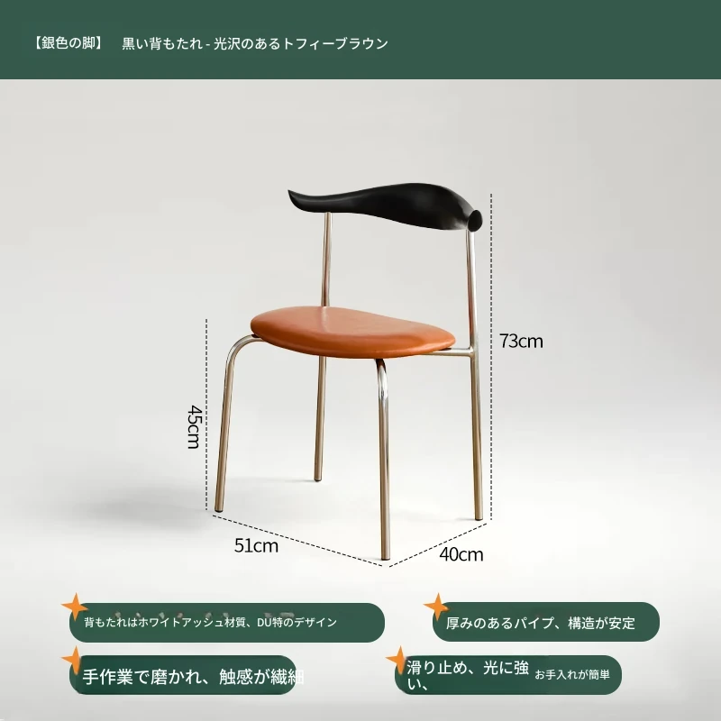 黒色の無垢材背もたれ-光沢のあるトフィー色クッション-銀脚