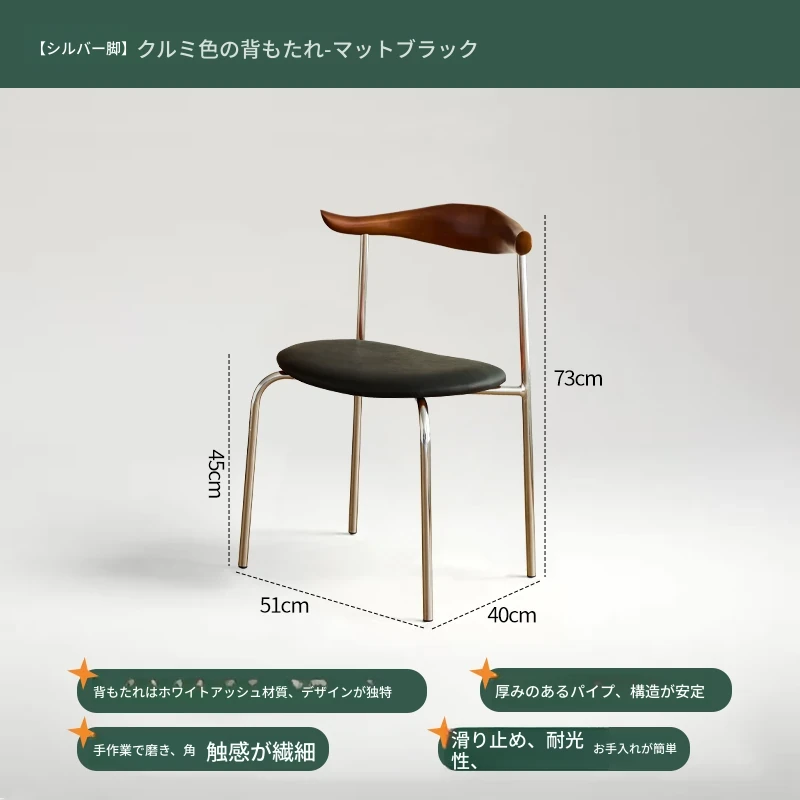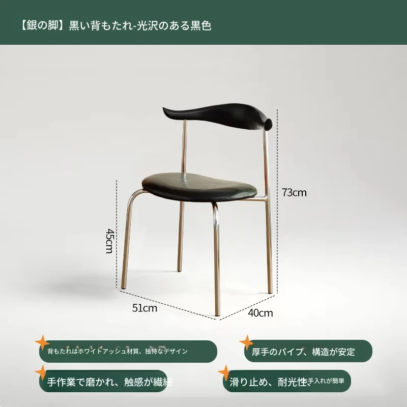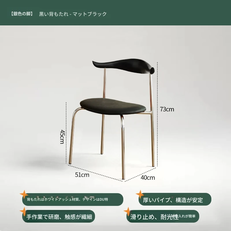 黒色の無垢材背もたれ-マットな黒クッション-銀脚