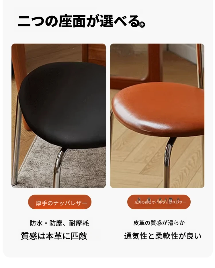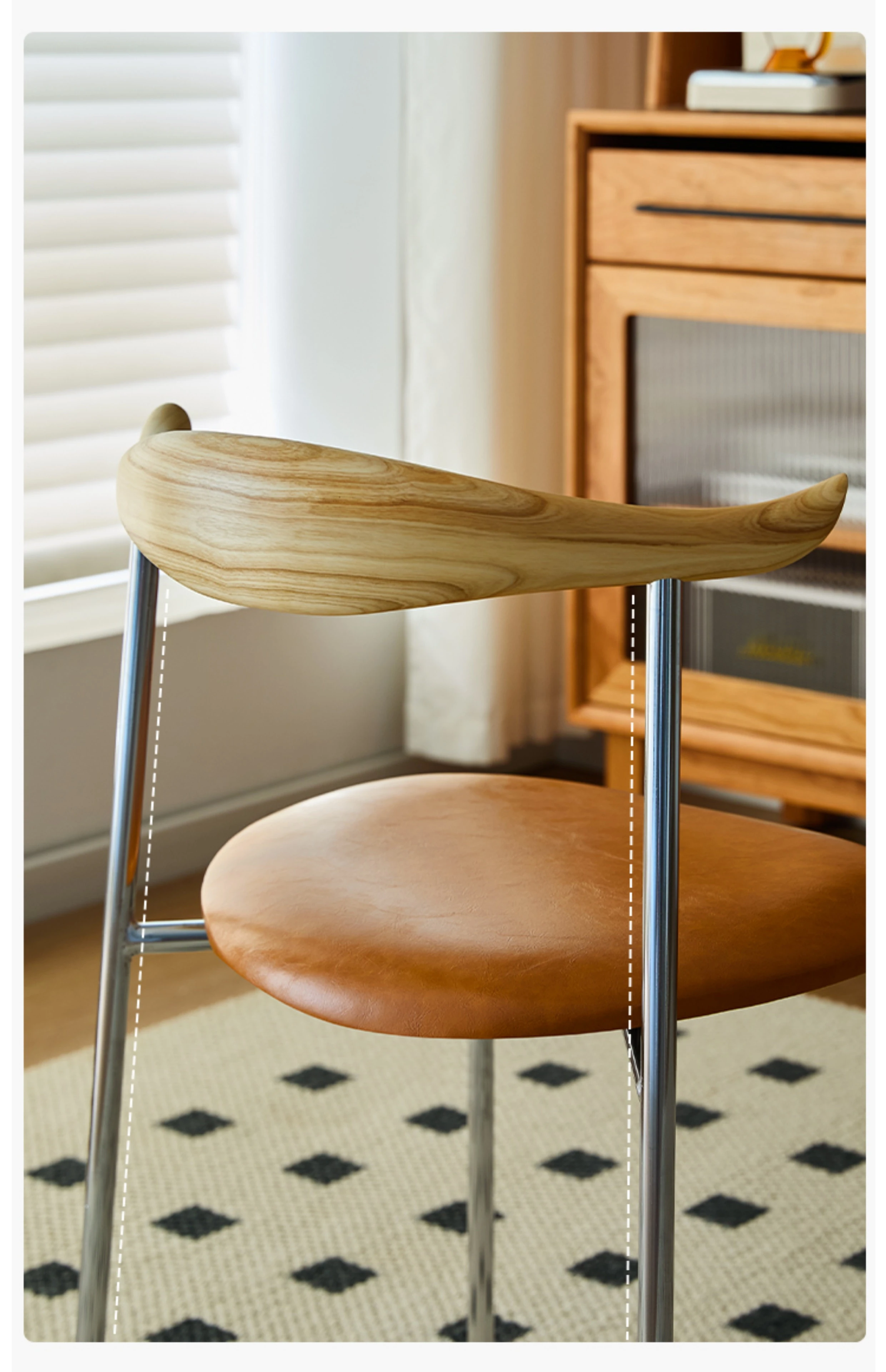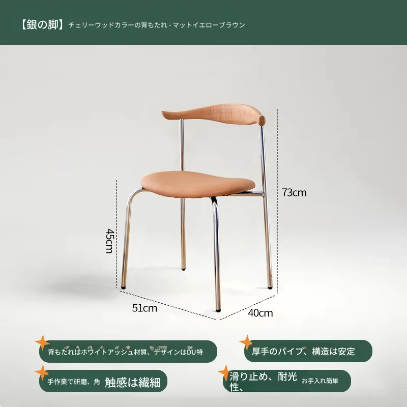 チェリー色の無垢材背もたれ-マットな黄褐色クッション-銀脚