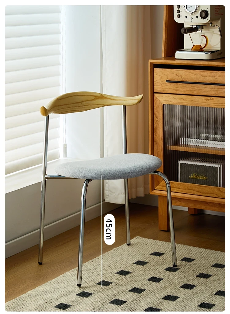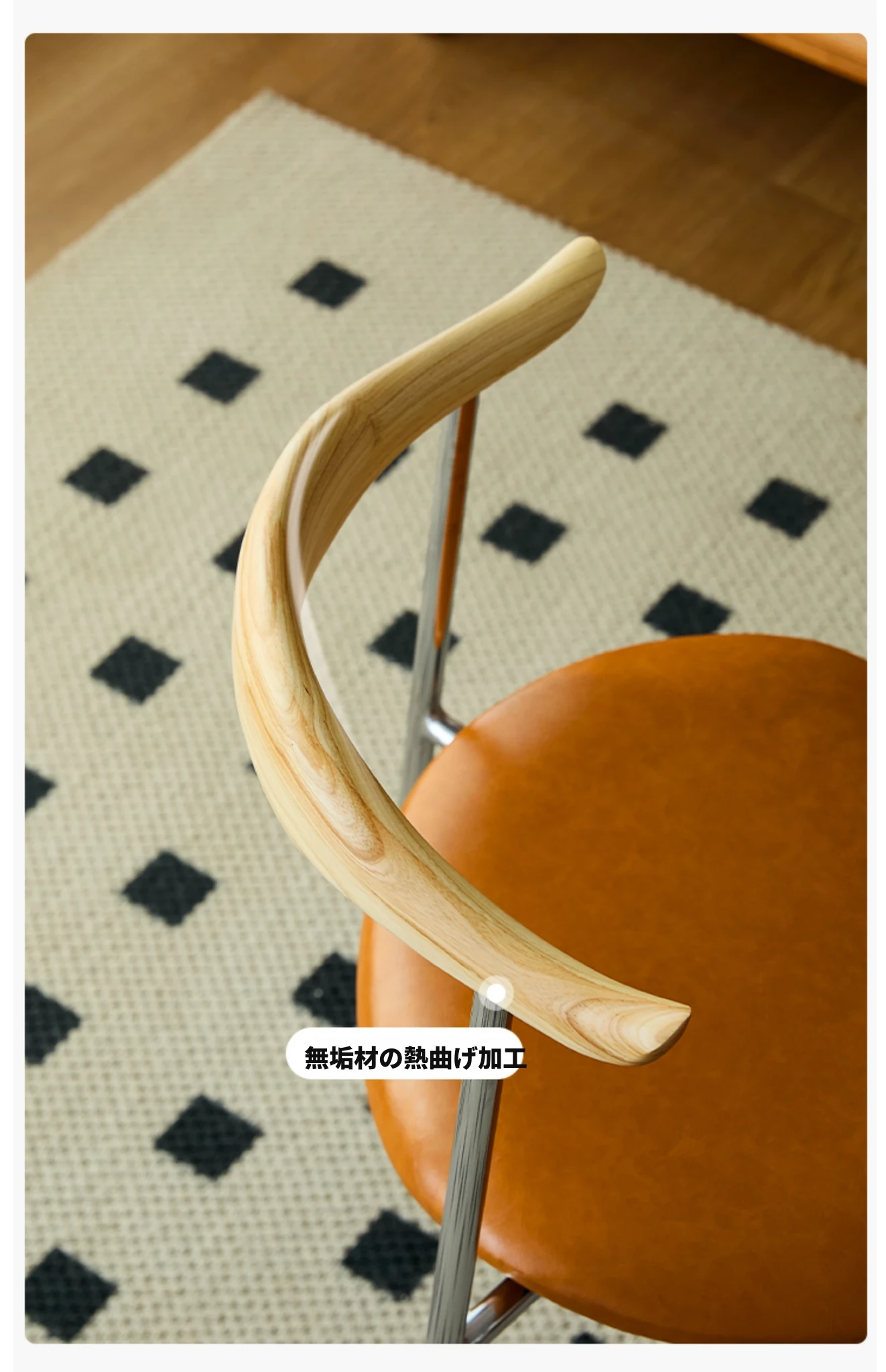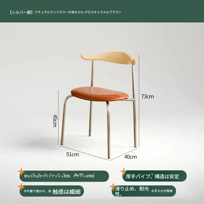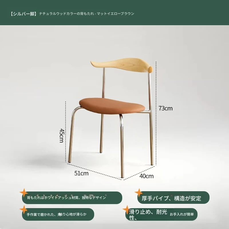 浅い木目色の無垢材背もたれ-マットな黄褐色クッション-銀脚