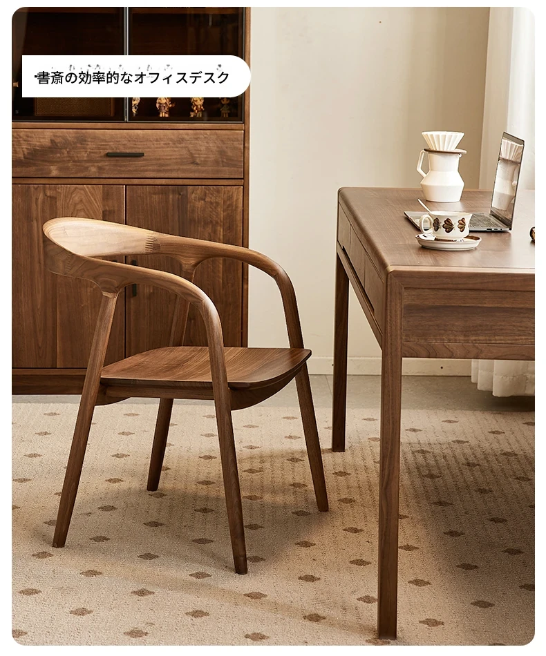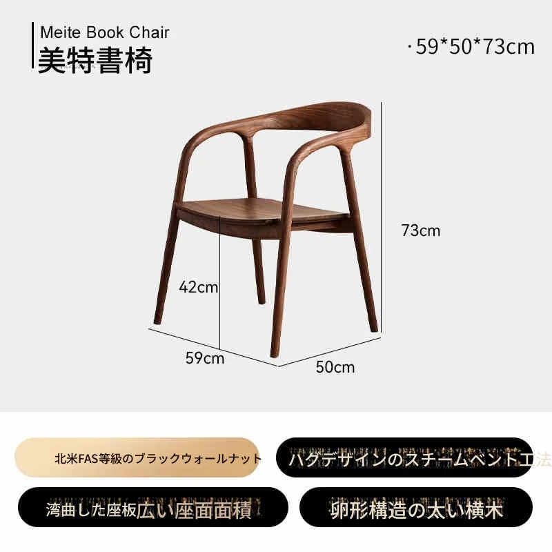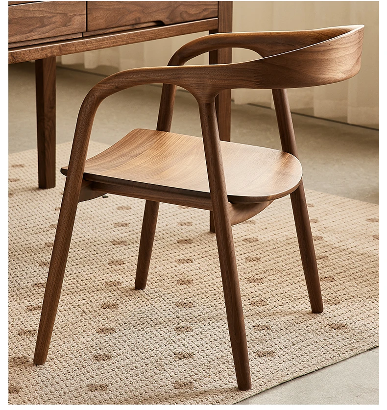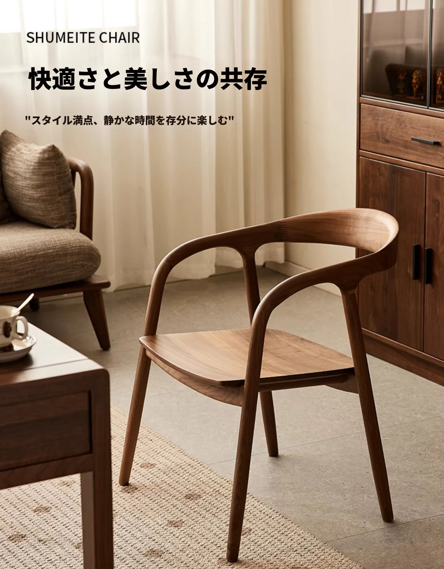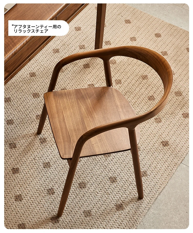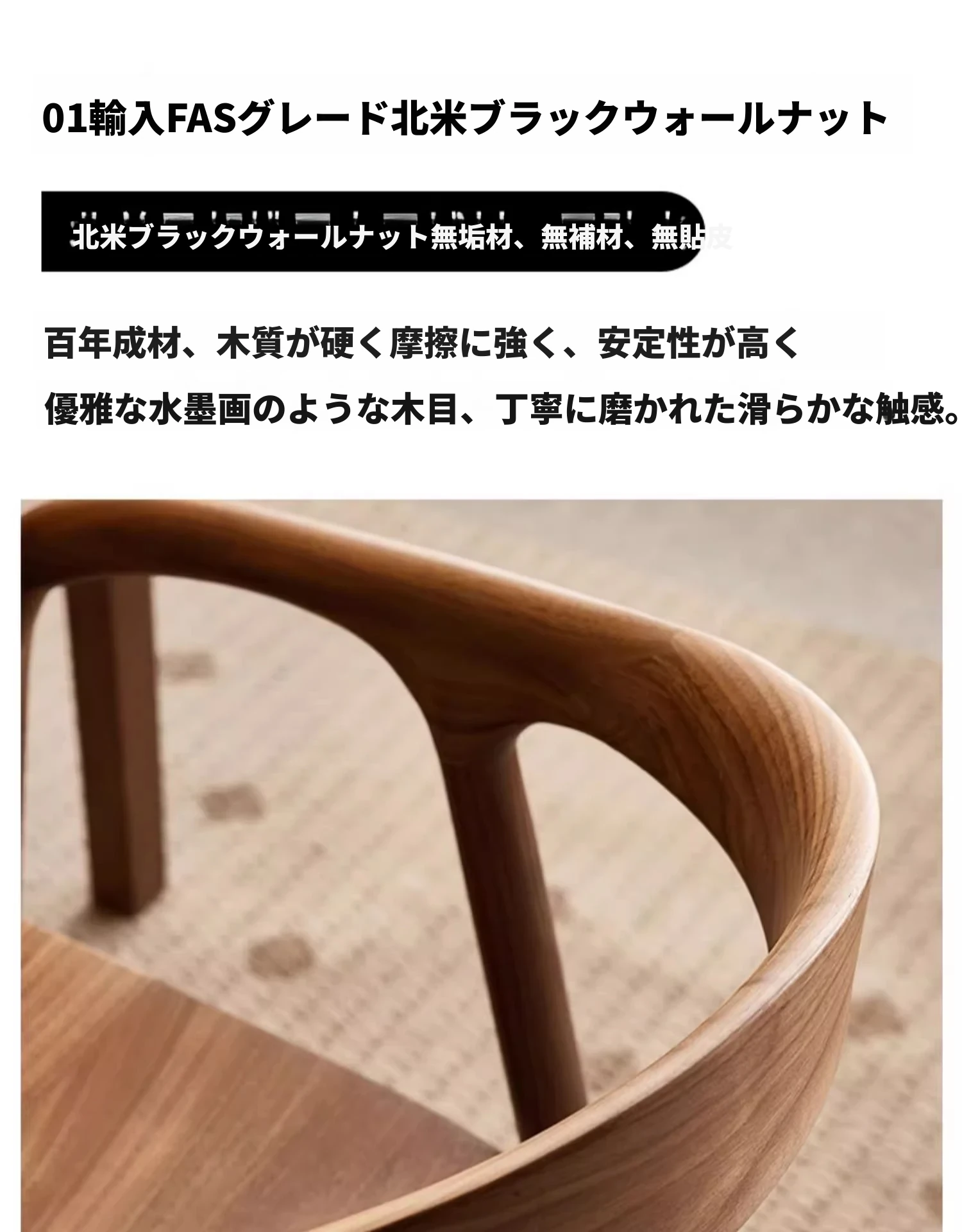 北米産ブラックウォールナット無垢材使用の全榫卯構造、快適なリラックス体験を提供するダイニングチェア。おしゃれな背もたれ付き、アームレスト付きのティーチェアや書斎用チェアとして最適です。