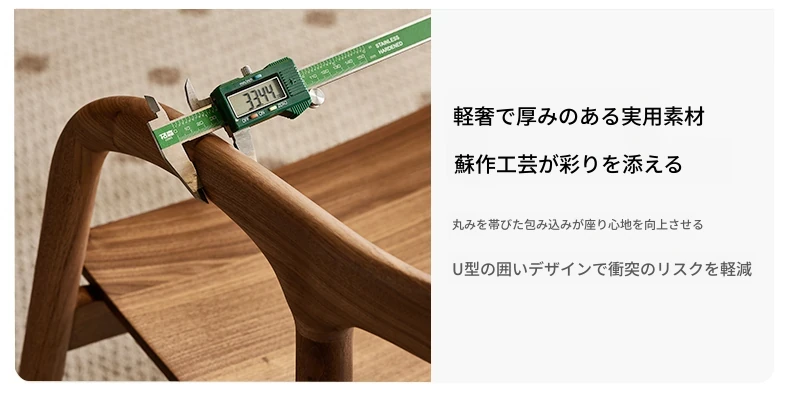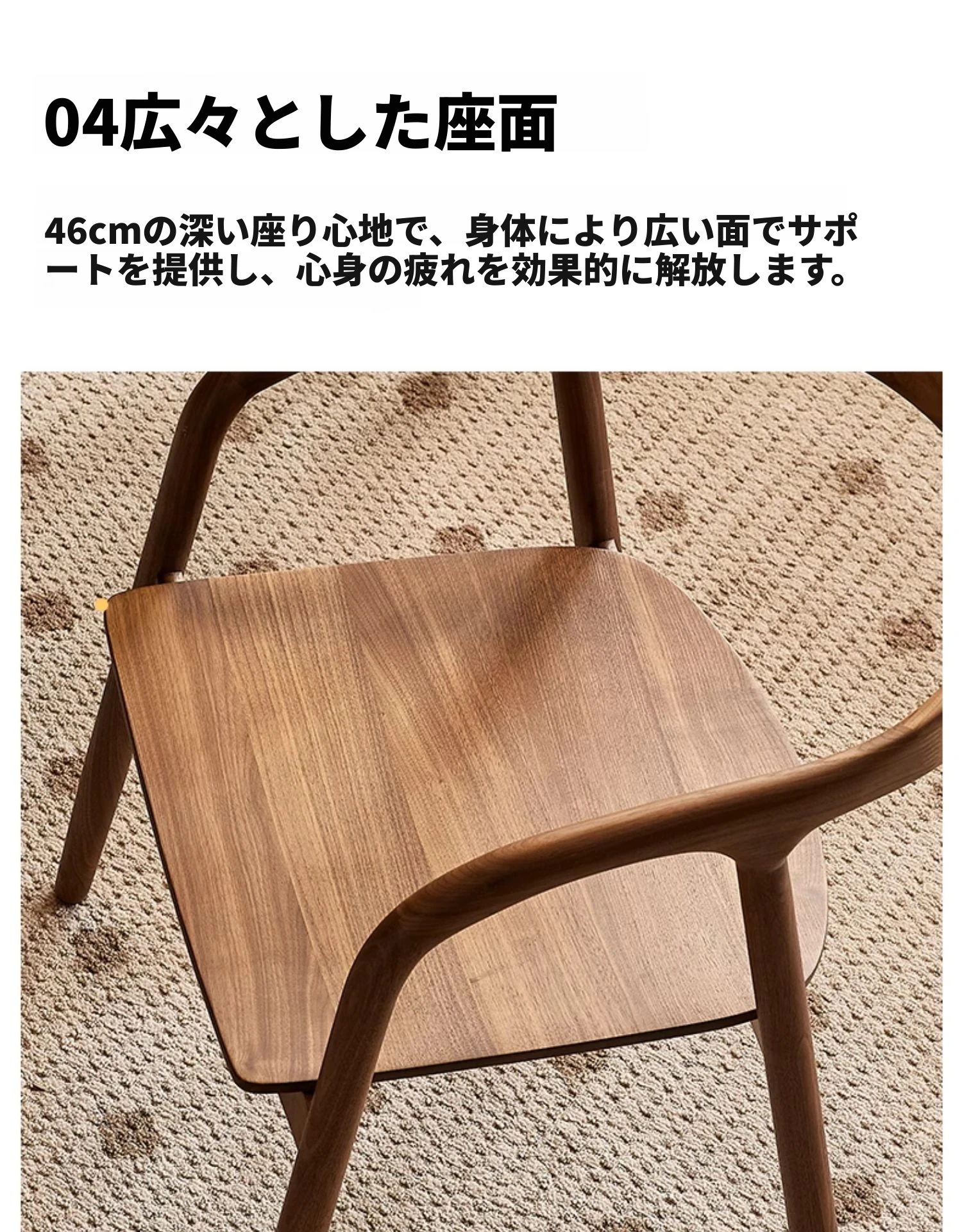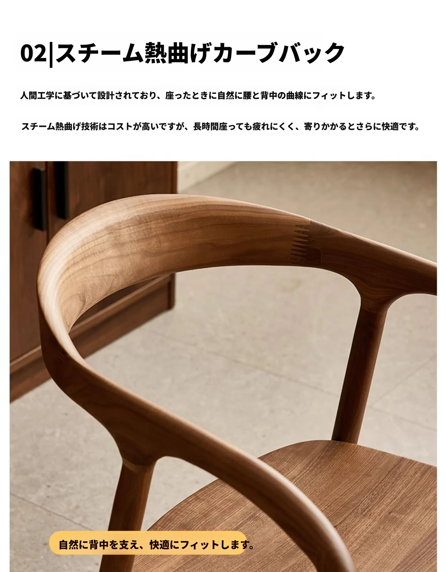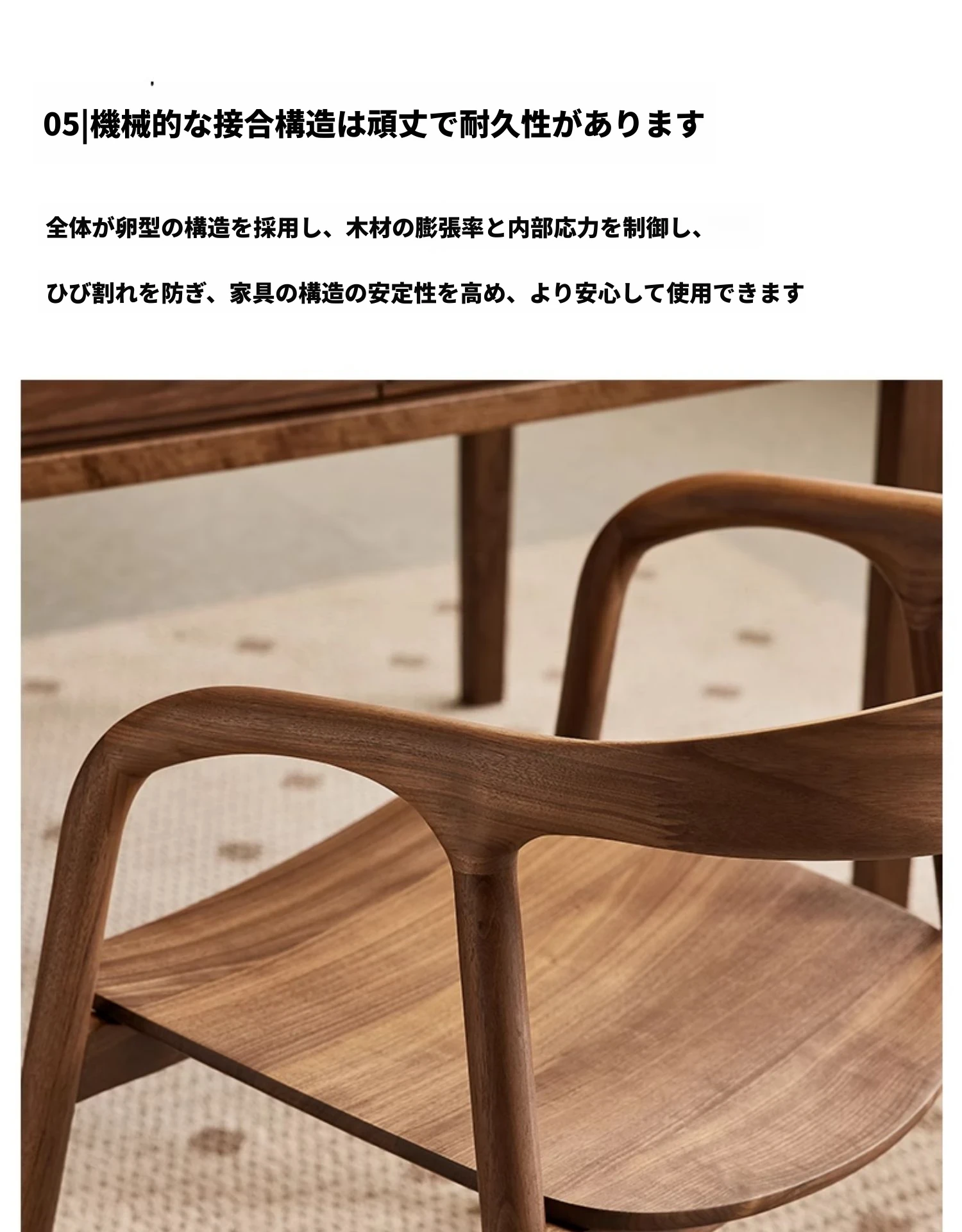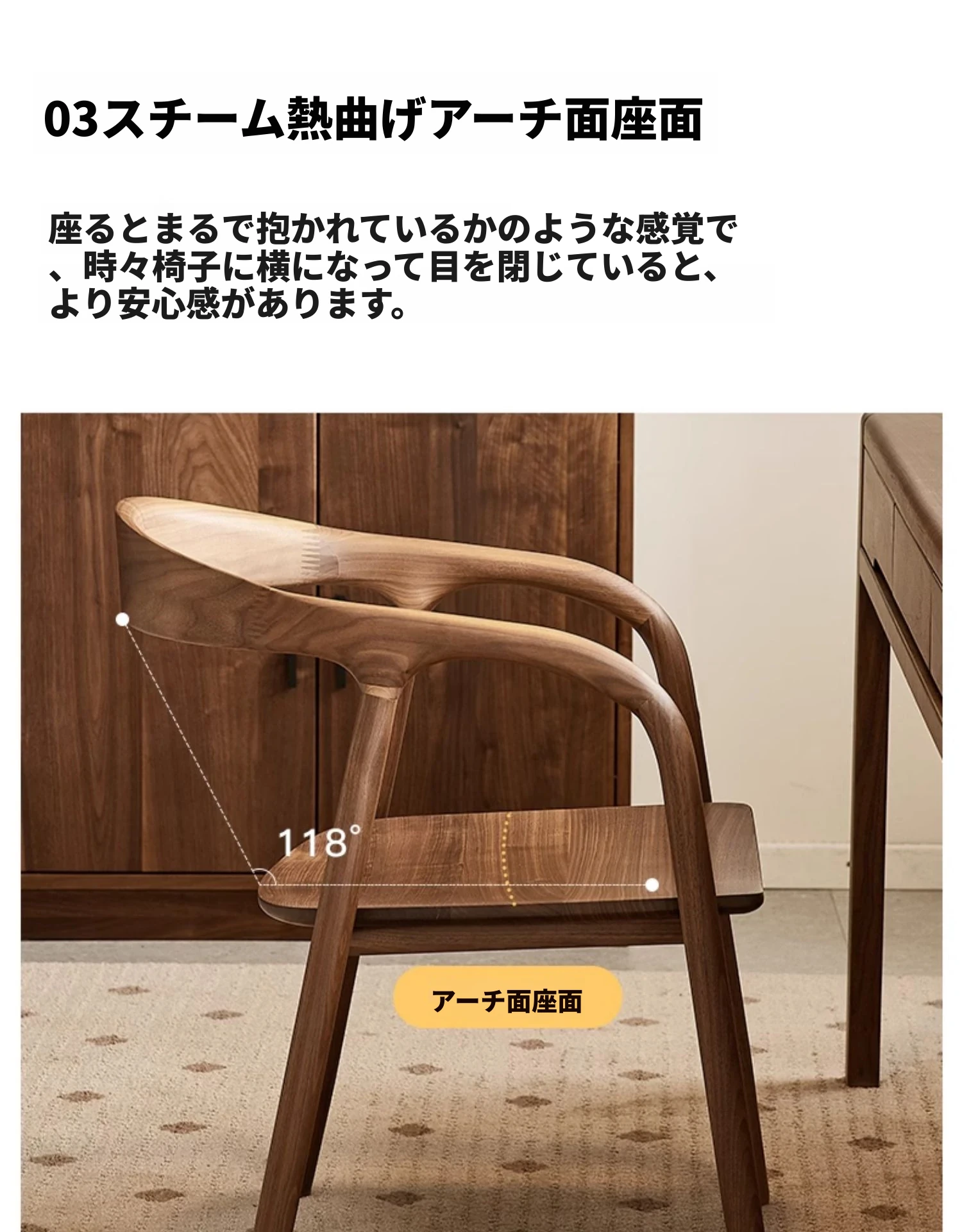 北米産ブラックウォールナット無垢材使用の全榫卯構造、快適なリラックス体験を提供するダイニングチェア。おしゃれな背もたれ付き、アームレスト付きのティーチェアや書斎用チェアとして最適です。