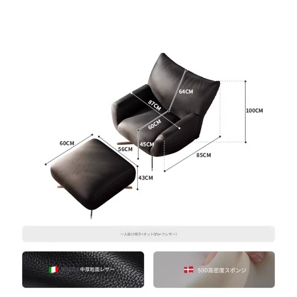 中古ブラック【輸入厚手本革】アームチェア+オットマン