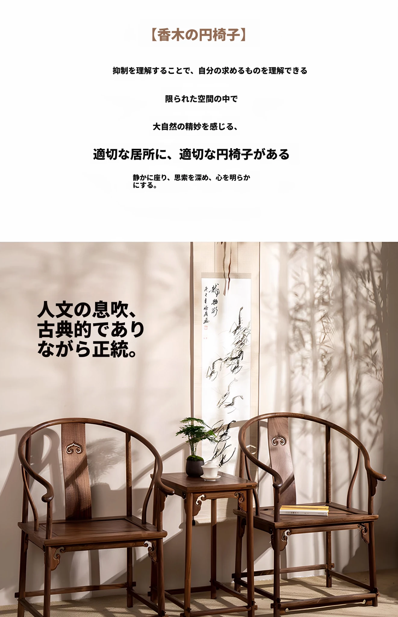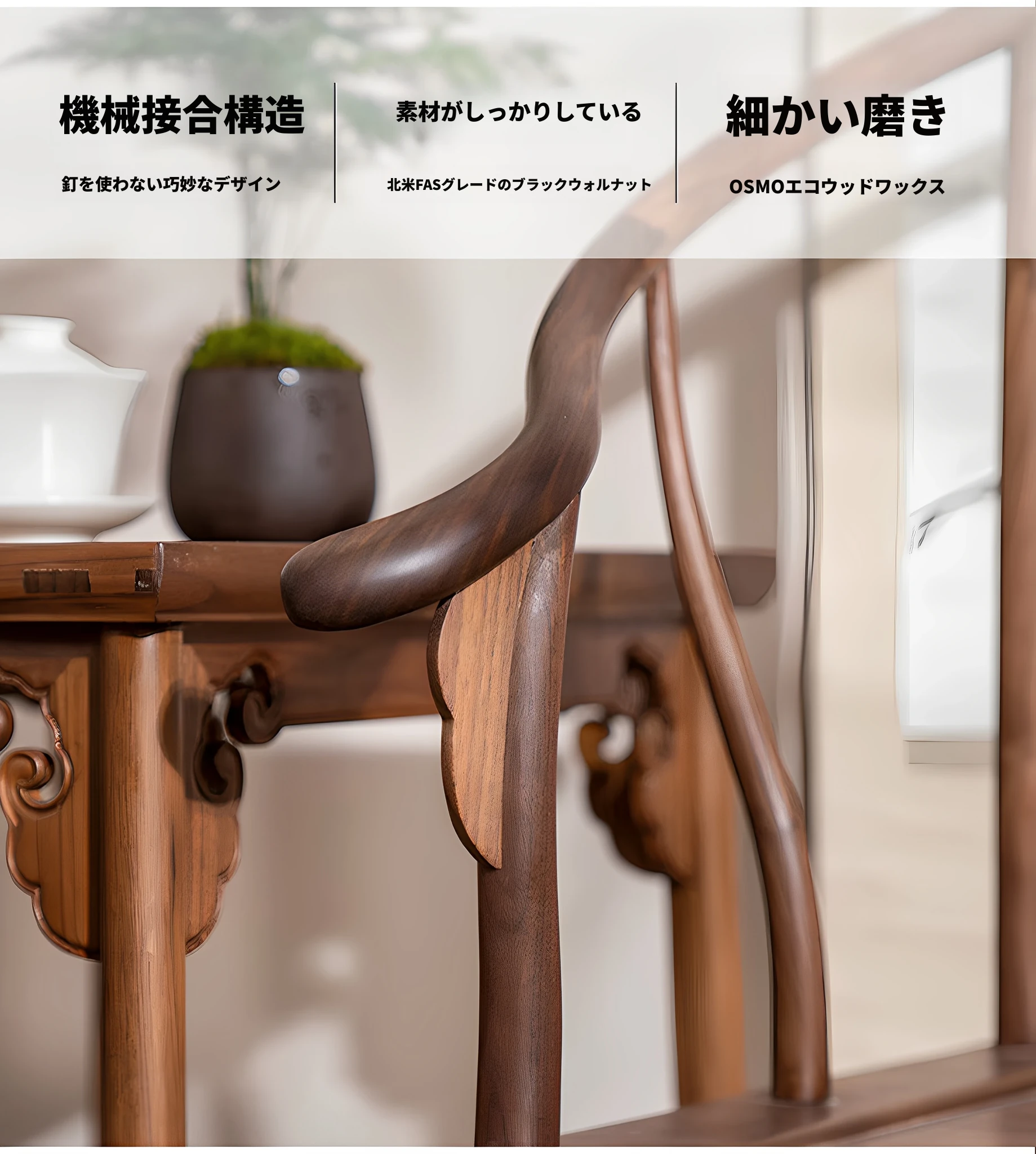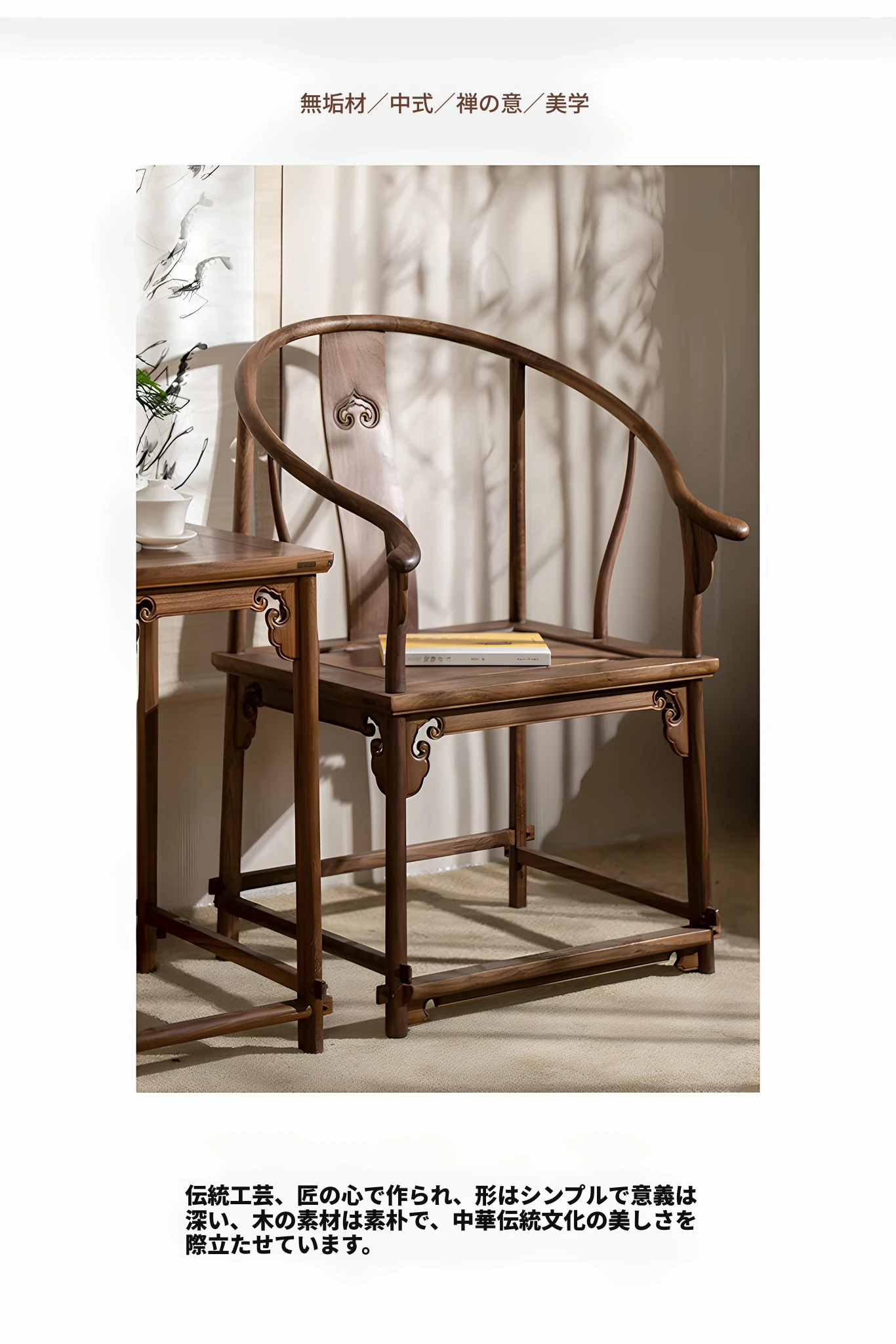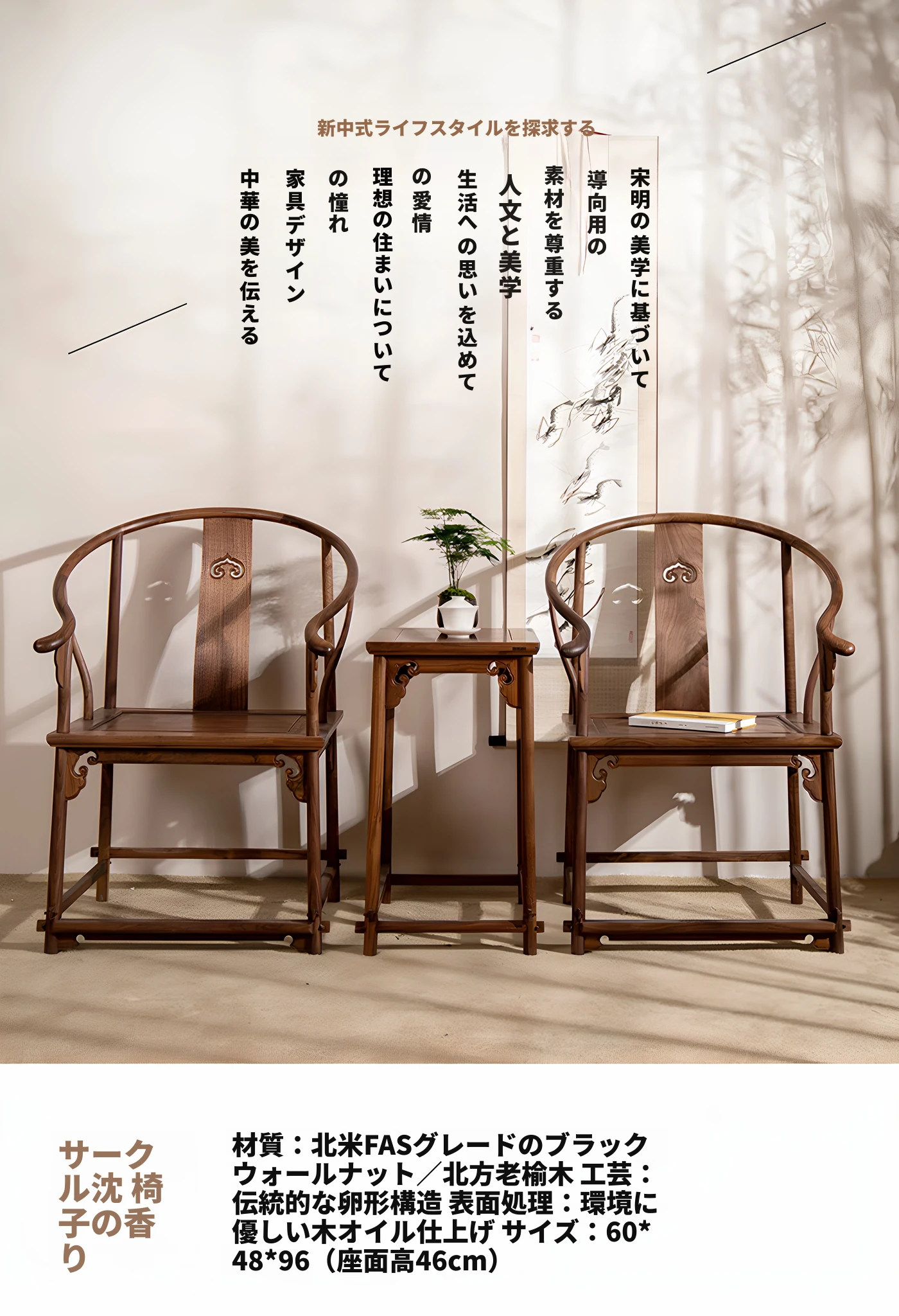 北米産ブラックウォールナットの実木製新中式3点セット!美しい明式禅スタイルのサークルチェアとティーテーブルで、デザインと快適さを両立。リラックスしたひとときをお楽しみください。