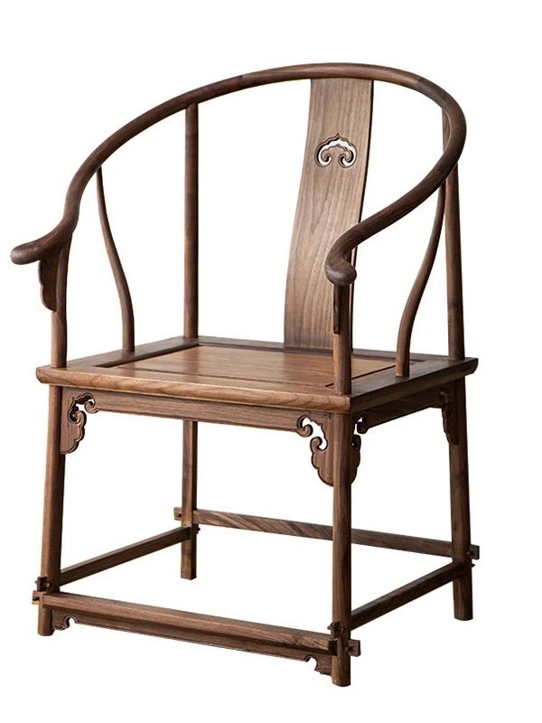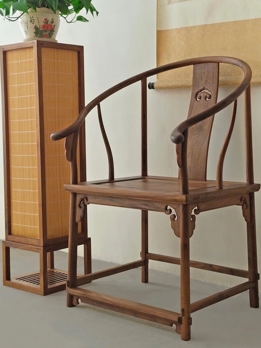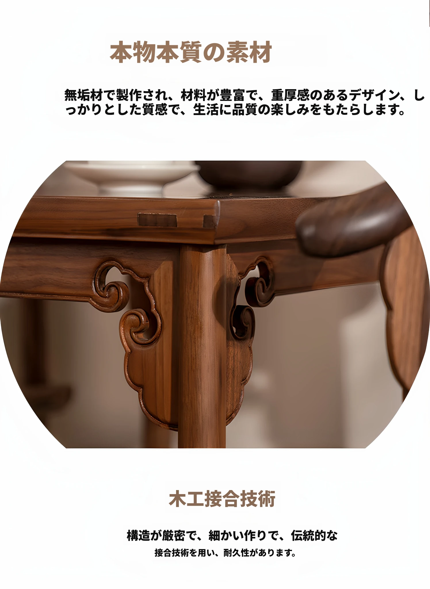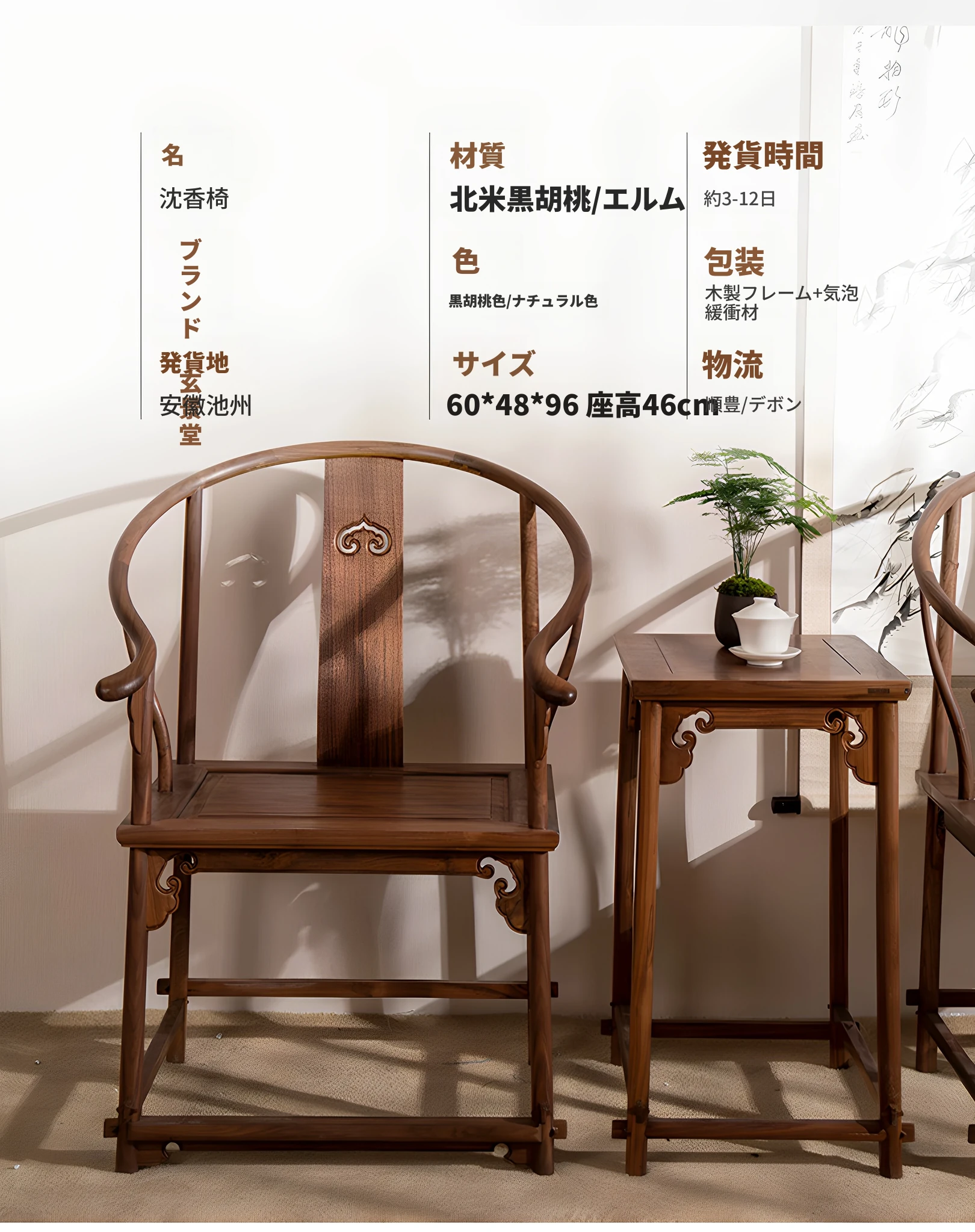 北米産ブラックウォールナットの実木製新中式3点セット!美しい明式禅スタイルのサークルチェアとティーテーブルで、デザインと快適さを両立。リラックスしたひとときをお楽しみください。
