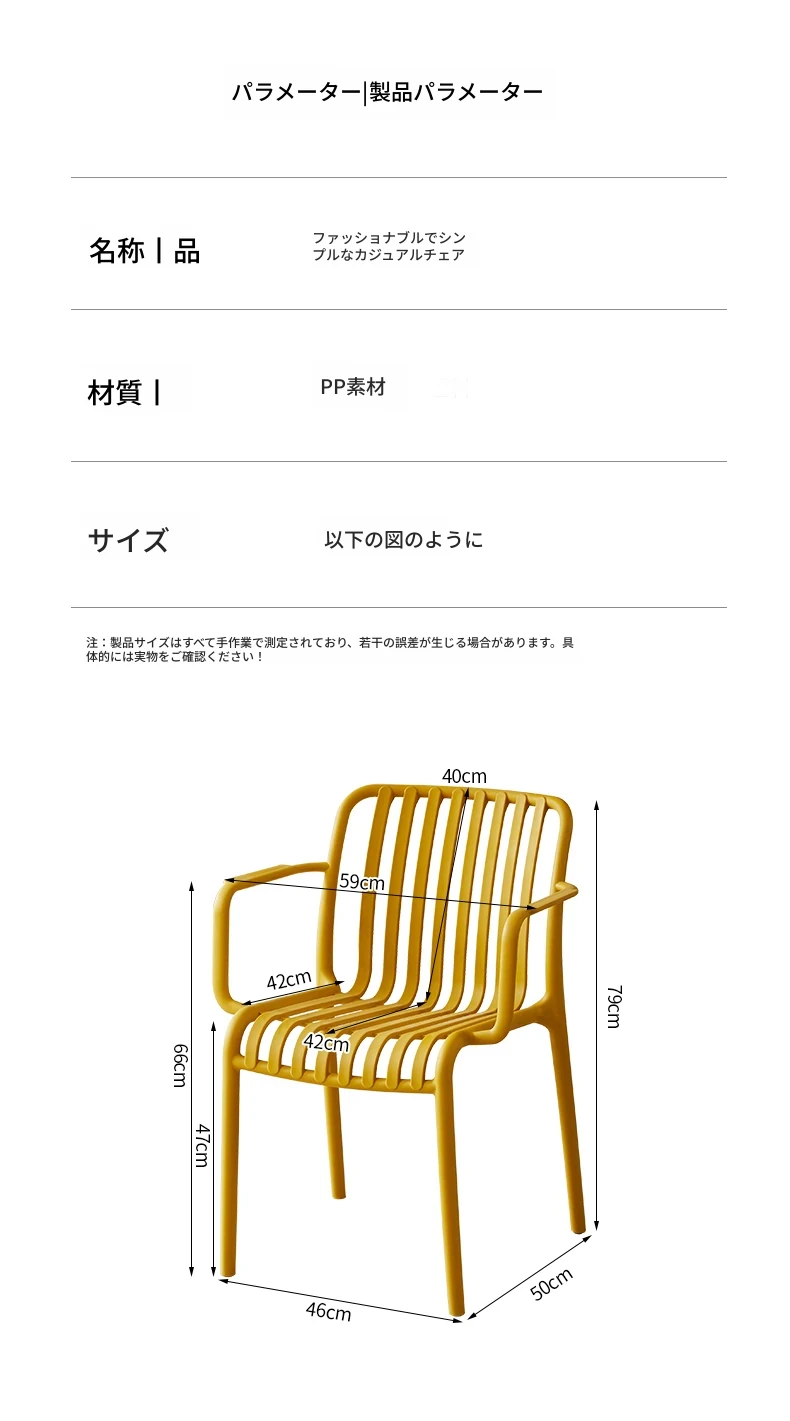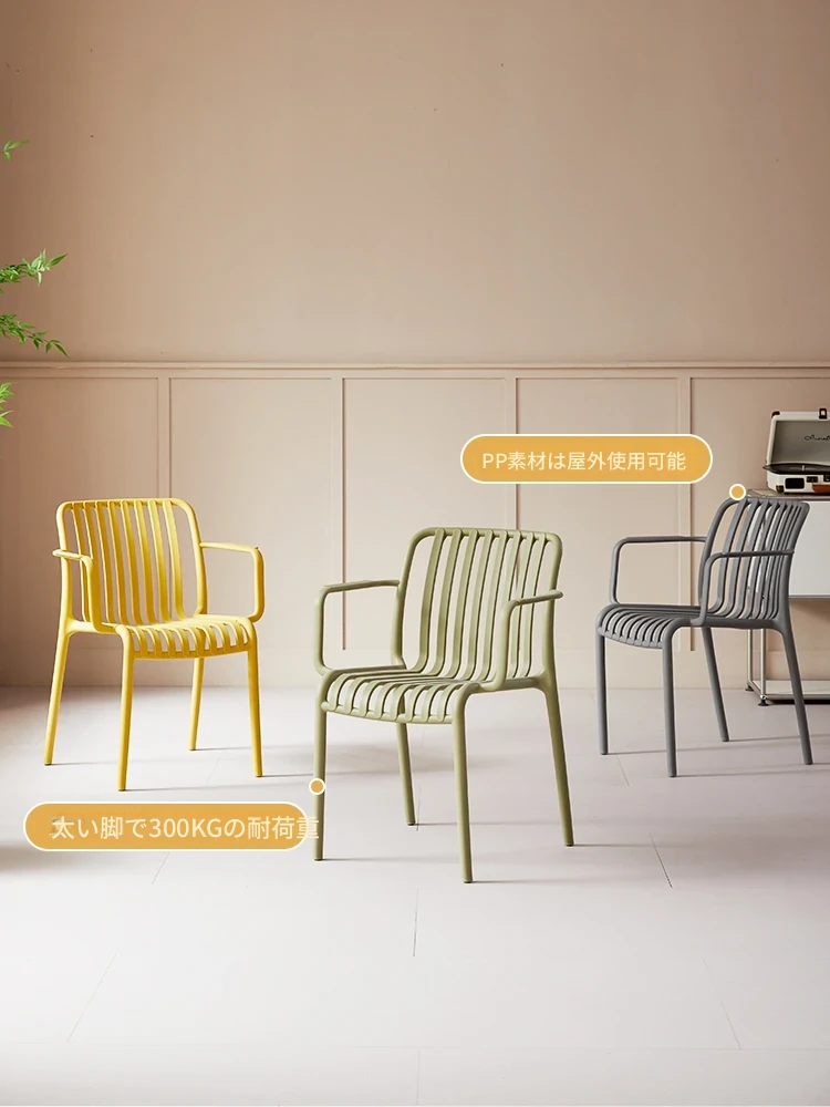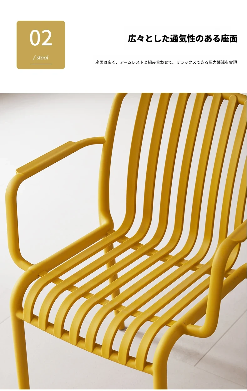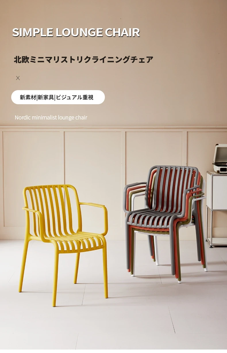 シンプルでスタイリッシュな家庭用プラスチック製ダイニングチェア!積み重ね可能で、リラックスできるアームチェアやバルコニー用、アウトドアやビーチにも最適。快適さと便利さを兼ね備えた一品です!